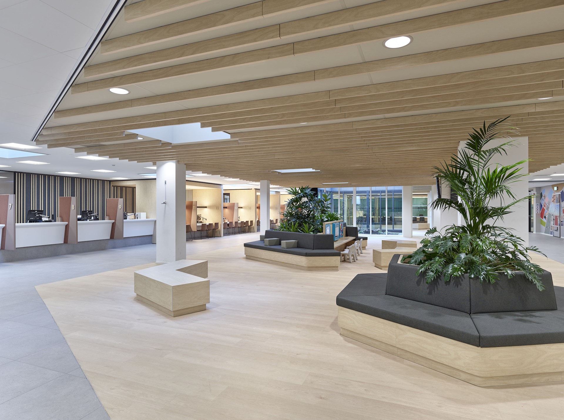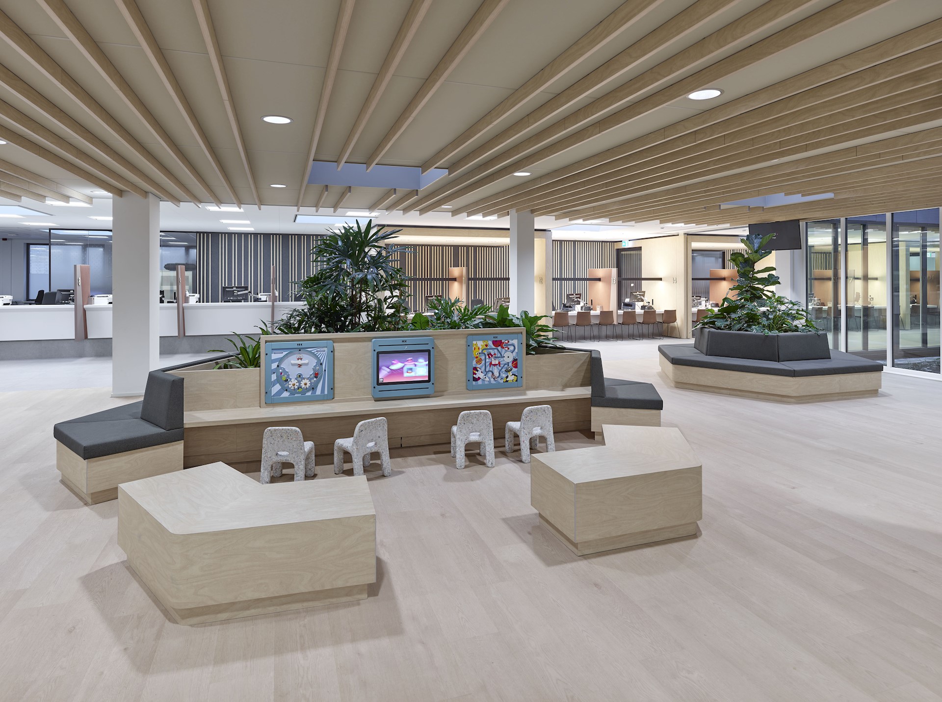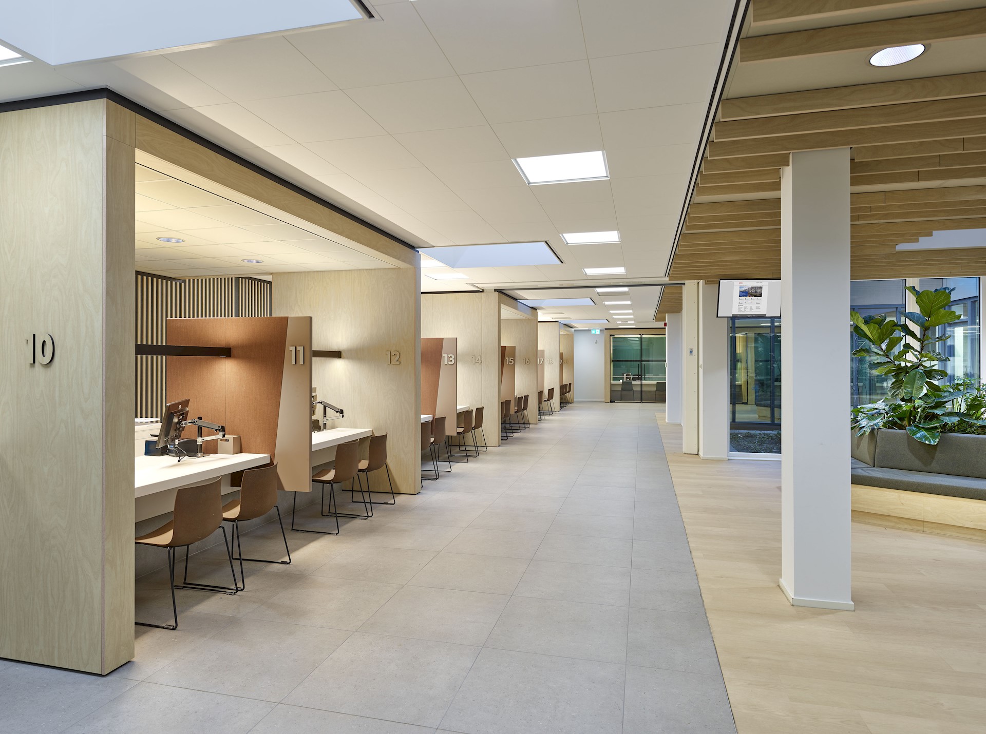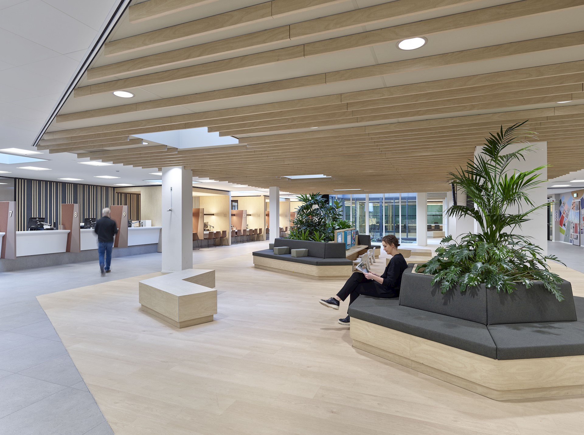 We hebben een ruim wachtgebied ontworpen, waarin bezoekers plaatsnemen totdat zij worden opgeroepen bij een van de verschillende balies. Het gebied is ingericht op gebruik door alle doelgroepen en voorzien van een internettafel, leestafel, voorzieningen voor kinderen en geschikte ruimte voor buggy’s en rollators. Bezoekers kunnen gericht of juist met de rug naar anderen in het wachtgebied plaatsnemen. Voor mensen die meer behoefte hebben aan privacy, zoals bezoekers voor de sociale hulpverlening, ligt verderop een wachtgebied in de luwte. Het plafond wordt geaccentueerd door houten latten, waardoor in deze grote ruimte alsnog een geborgen gevoel is gecreëerd. De open balies en lange zichtlijnen creëren een veilige en overzichtelijke omgeving.