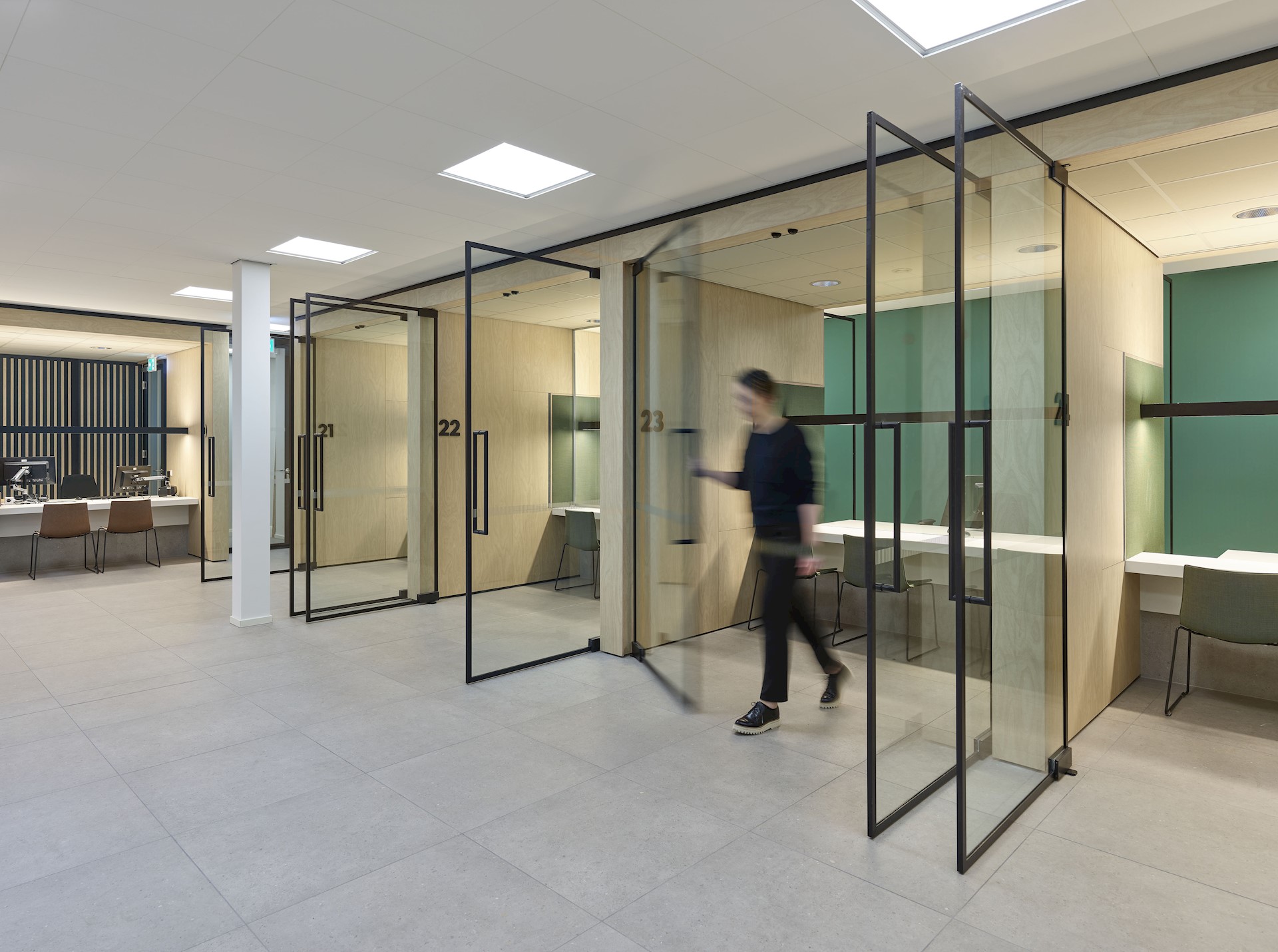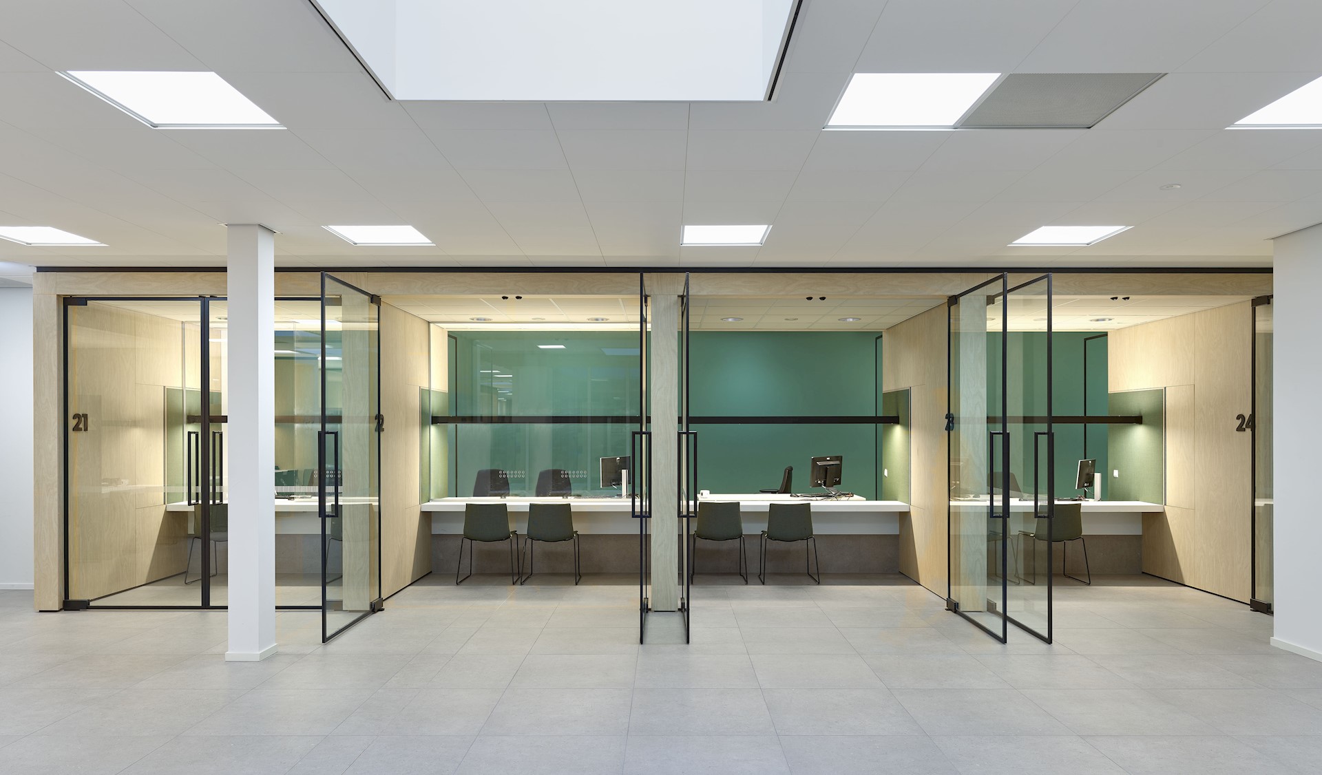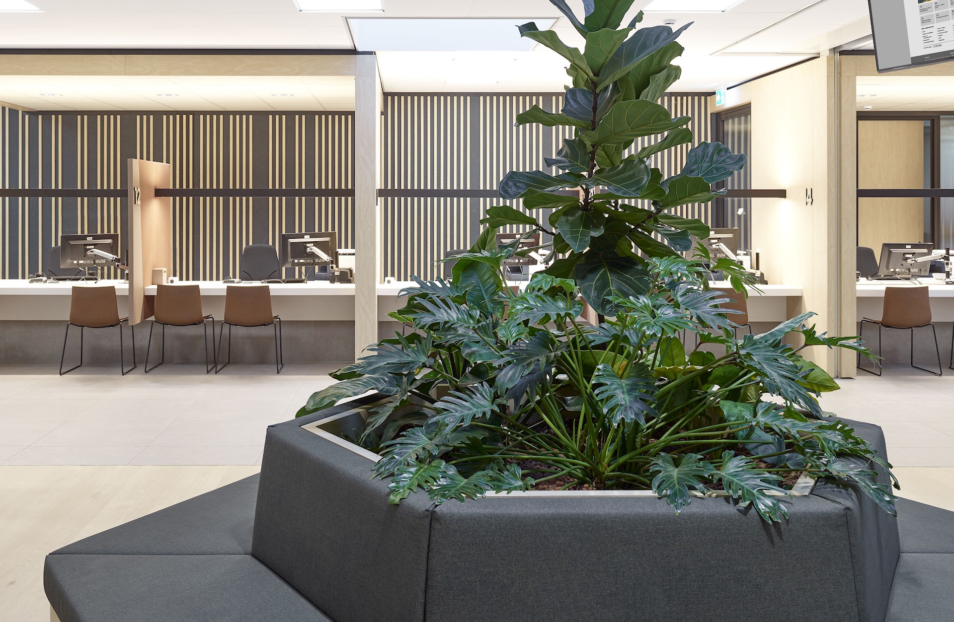 De halfomsloten balies met zitgelegenheid worden gebruikt door burgerzaken en de burgerlijke stand. Daar worden veel gegevens uitgewisseld, bijvoorbeeld bij het aanvragen van een paspoort. Akoestisch geactiveerde wanden met microperforatie zorgen voor een prettige akoestiek.