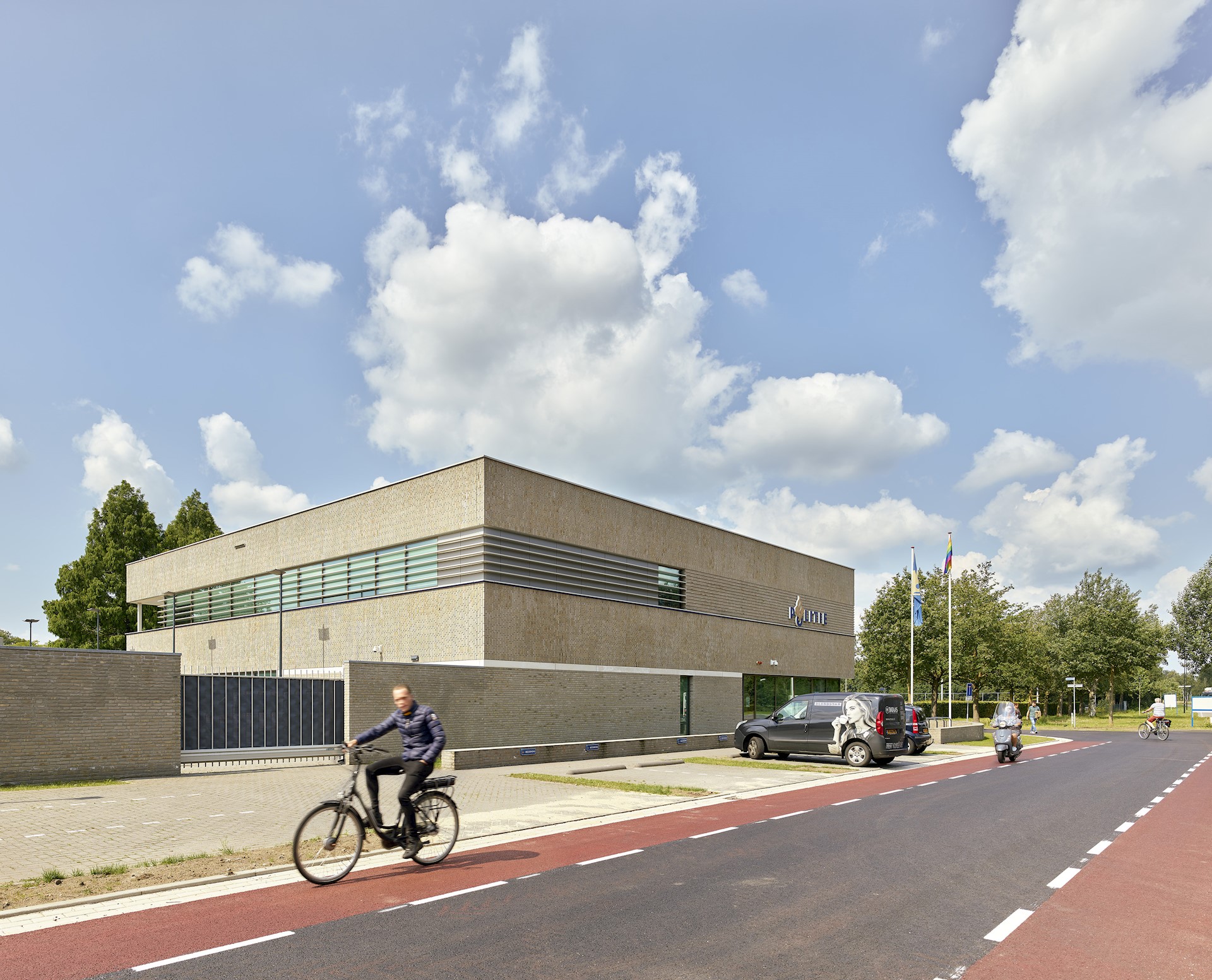 Het gevelconcept bestaat uit duidelijke metselwerkbanden die doorlopen in de terreinafscheiding. De banden wisselen horizontaal, verticaal en verspringend metselwerk af, waardoor er een prachtig spel ontstaat. Deze variatie in de metselwerkbanden geeft het gebouw een ambachtelijk karakter. Daarnaast is baksteen een onderhoudsvrij materiaal, wat gunstig is voor de exploitatiekosten. Ter hoogte van de werkgebieden wordt het metselwerk t.b.v. daglichttoetreding ingeruild voor ramen. Om wél de voordelen van daglicht te hebben, maar in de zomermaanden opwarming te voorkomen, hebben we hier light shelves toegepast. Deze light shelves lopen door vanuit het metselwerk, zodat de rust in de gevel bewaard blijft.
