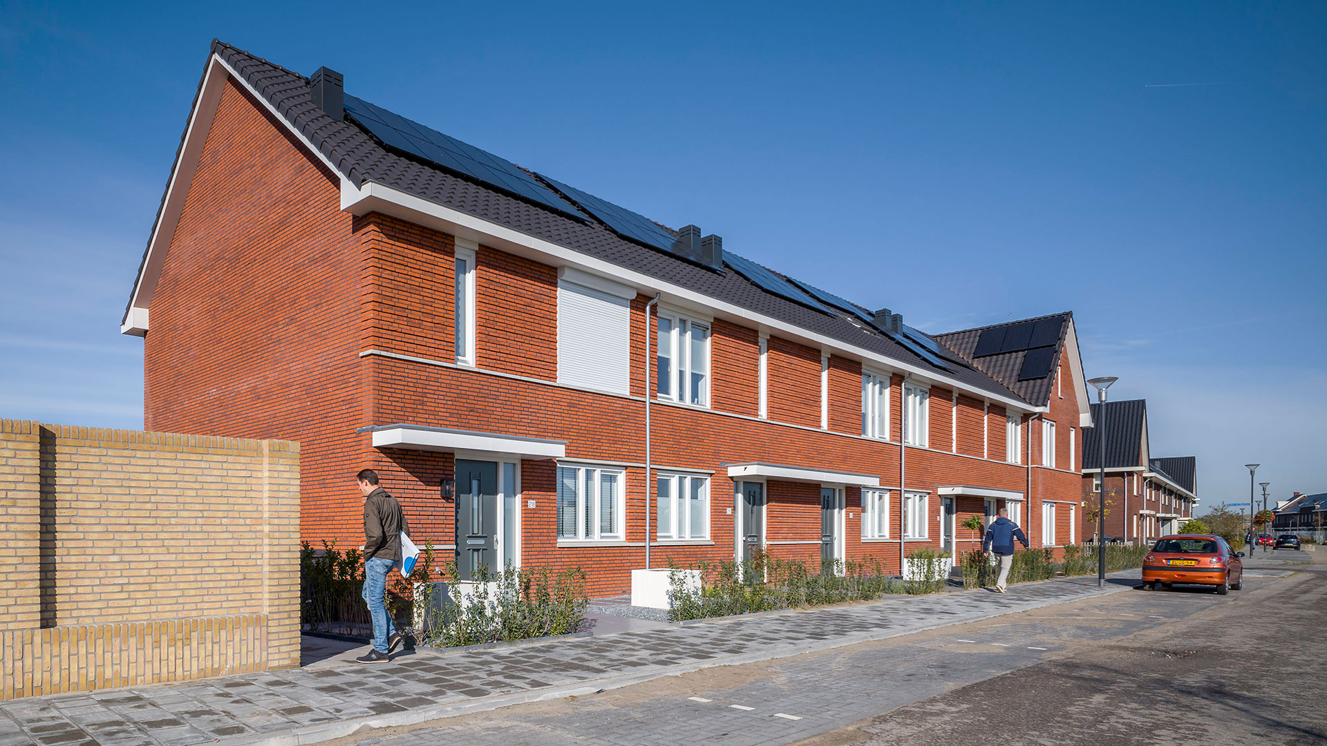 De kroon op de derde bouwlaag van de tussenliggende woningen verbindt de accenten met elkaar. In de gevel bevinden zich daarnaast nog verschillende woningoverstijgende, vormgevende elementen, zoals bijvoorbeeld de luifels. Hiermee is deze rij meer dan een optelling van woningen, maar een totaalcompositie. De zijgevels van de hoekwoningen krijgen door het spel van baksteenvolumes een extra accent. Zo ontstaat een rij woningen met een geheel eigen, uitgesproken karakter dat een blikvanger wordt voor de wijk.