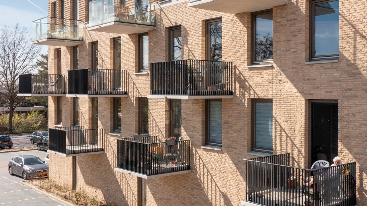 De gevel van het gebouw heeft een elegante en vriendelijke uitstraling gekregen. Het gebruik van verticale lijnen zorgt ervoor dat de associatie met een standaard galerijflat verdwijnt.