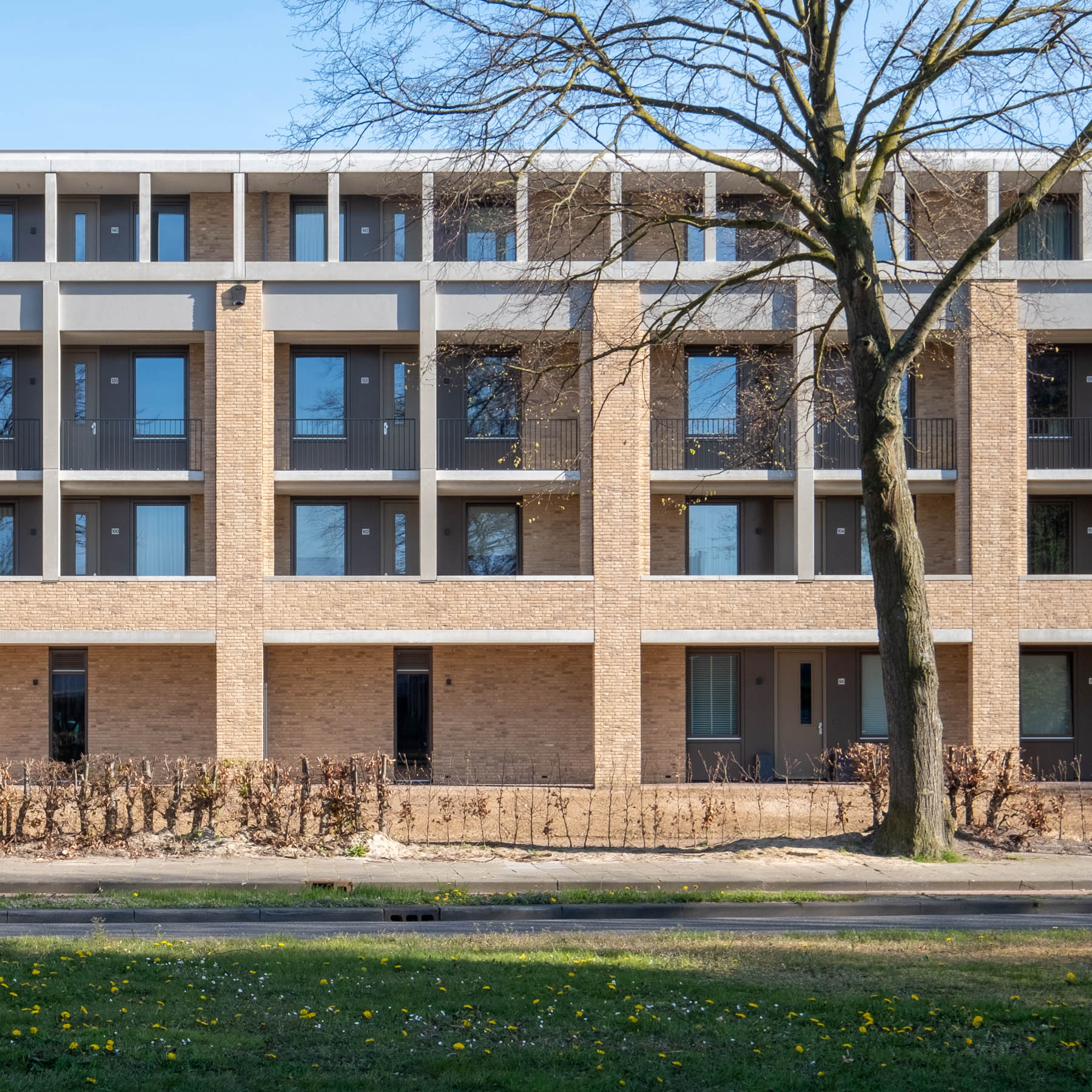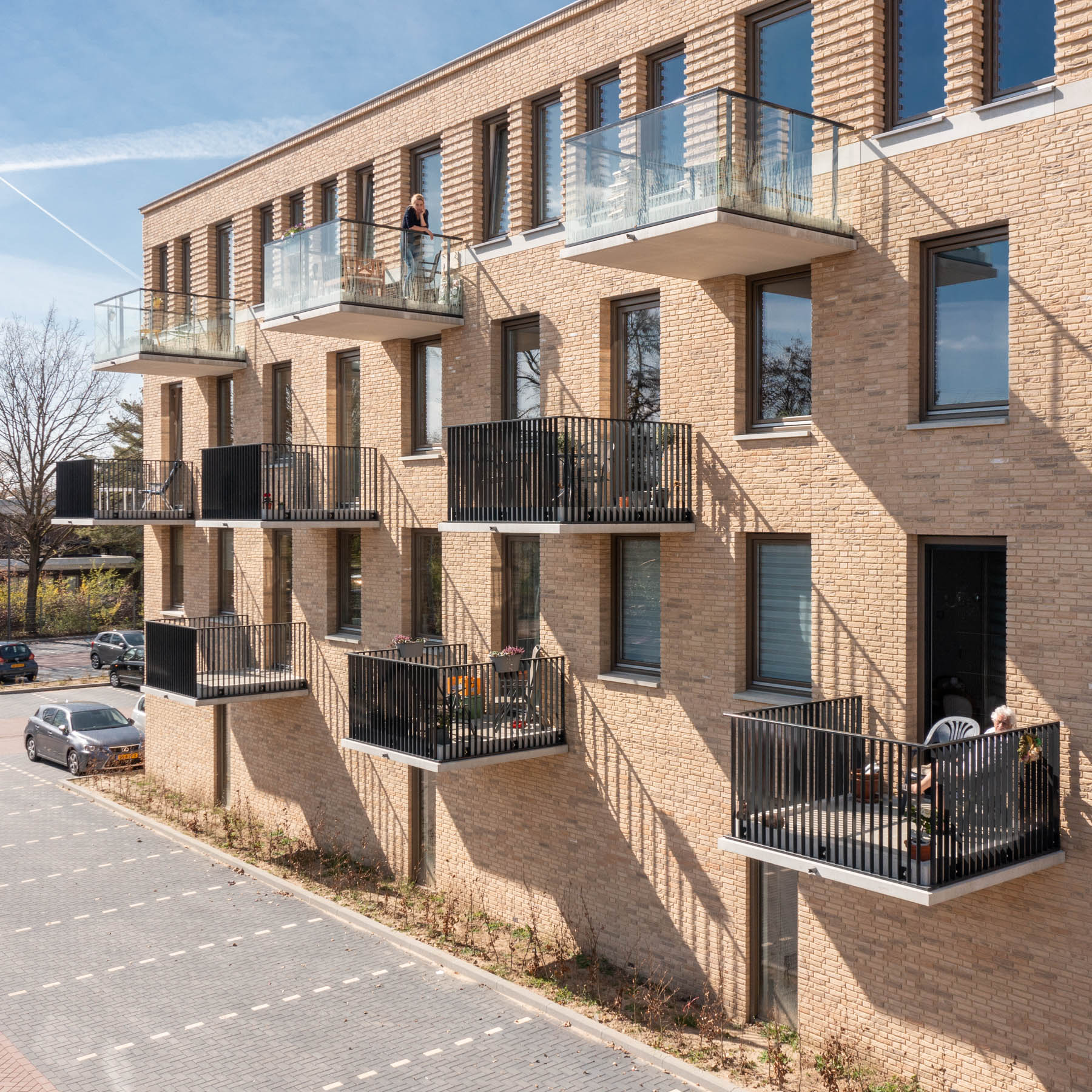 De gevel van het gebouw heeft een elegante en vriendelijke uitstraling gekregen. Het gebruik van verticale lijnen zorgt ervoor dat de associatie met een standaard galerijflat verdwijnt.