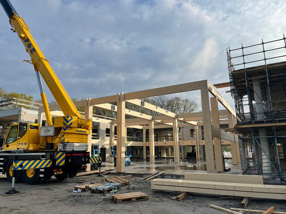Het hergebruikte betonnen casco van het duurzame Huis van de Gemeente Voorst wordt aangevuld met een nieuwe, gelamineerde houtconstructie