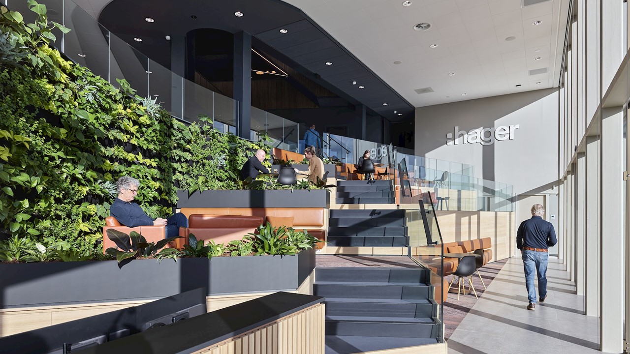 Het nieuwe gebouw is vormgegeven als een eenheid, met gebruik van hoogwaardige materialen en detaillering. Een huisvesting die de identiteit van Hager overal uitdraagt. Zo wilde Hager graag een ‘warm’ en toegankelijk pand met een informele sfeer, zowel in het publieke als het werkgebied. De warme kleuren die wij hiervoor hebben toegepast, zijn afgeleid van koper, de verbinder in Hagers elektrotechnische producten. Ook is het volledige exterieur uitgevoerd in een handvorm baksteen met een warme kleur in een Noors kettingverband.