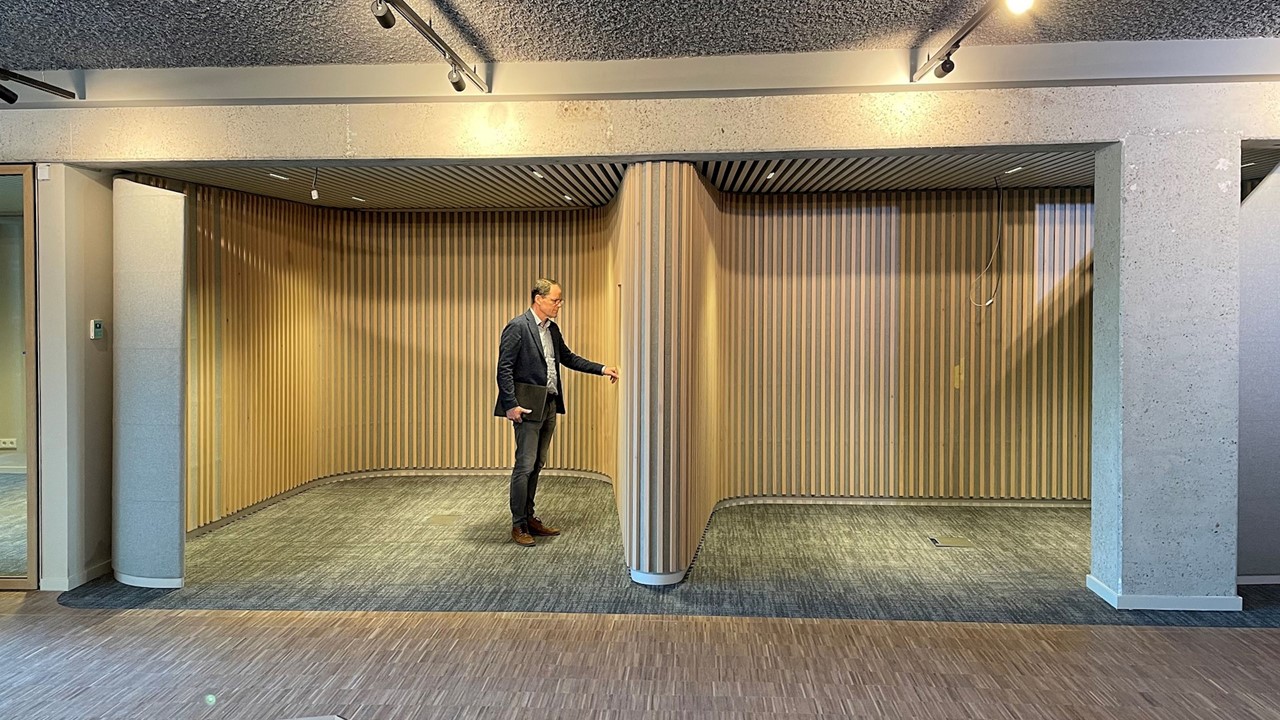 De betonconstructie van het oude gemeentehuis, gebouwd in de jaren ’80, is nu veel meer dan vroeger zichtbaar. Met de nieuwe, gelamineerde houtconstructie borduren we voort op deze robuuste kolomstructuur. Samen vormen deze een compact, duurzaam en circulair gemeentehuis.