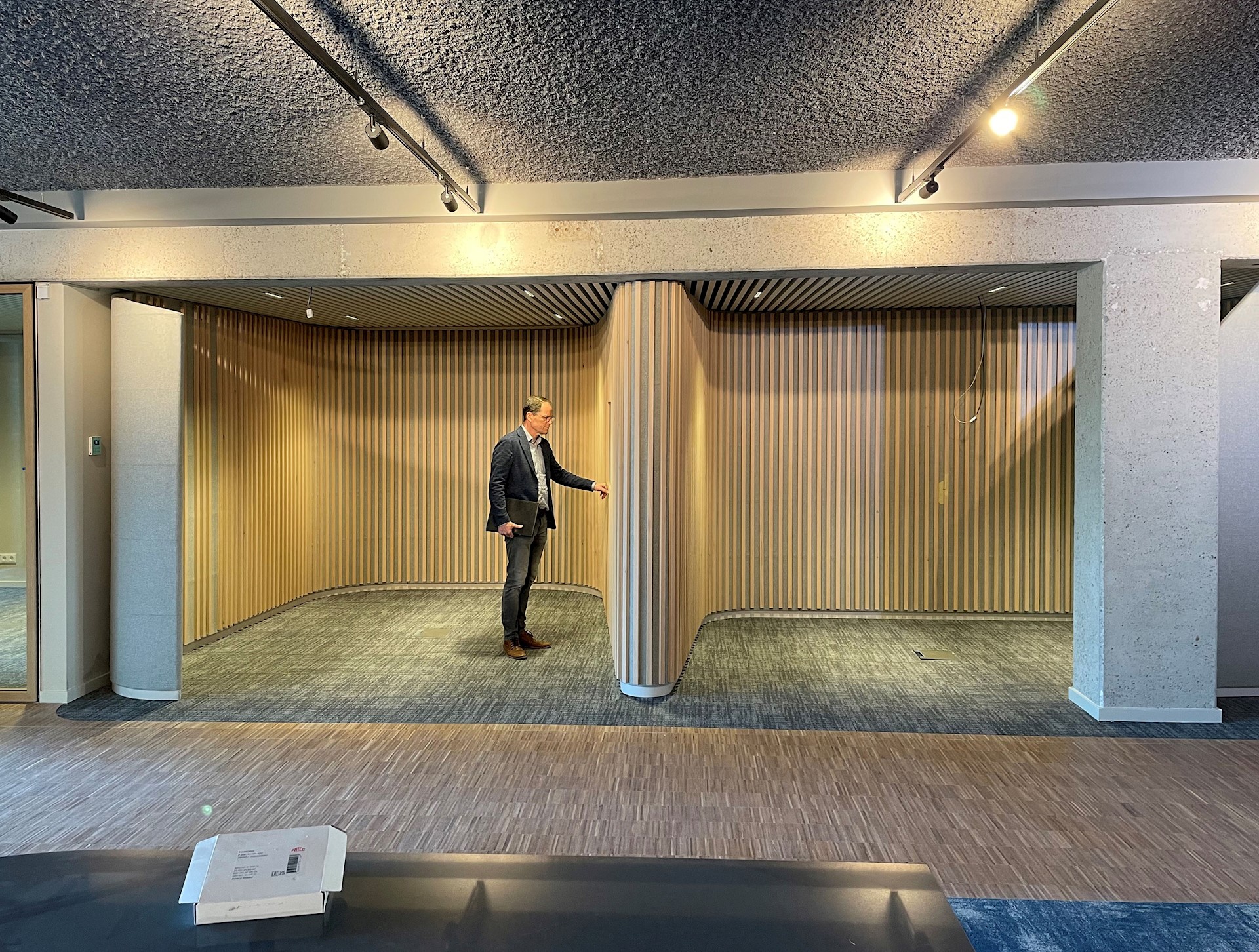 De betonconstructie van het oude gemeentehuis, gebouwd in de jaren ’80, is nu veel meer dan vroeger zichtbaar. Met de nieuwe, gelamineerde houtconstructie borduren we voort op deze robuuste kolomstructuur. Samen vormen deze een compact, duurzaam en circulair gemeentehuis.