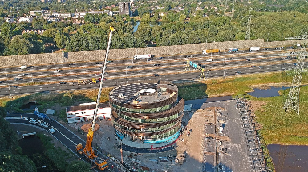 Het belevingskantoor aan de A2 is het nieuwe hoofdkantoor van bedrijfscateraar Appèl en onderwijscateraar Markies Catering, onderdeel van Appèl. De stalen wenteltrap van Hektracon is in twee delen het gebouw in gehesen. Een gaaf gezicht op de vroege maandagmorgen.