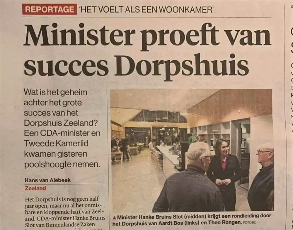 ‘Het voelt als een woonkamer. Ik ben heel erg onder de indruk.’ Wat een mooie woorden van minister Hanke Bruins Slot over het recent opgeleverde Dorpshuis Zeeland!