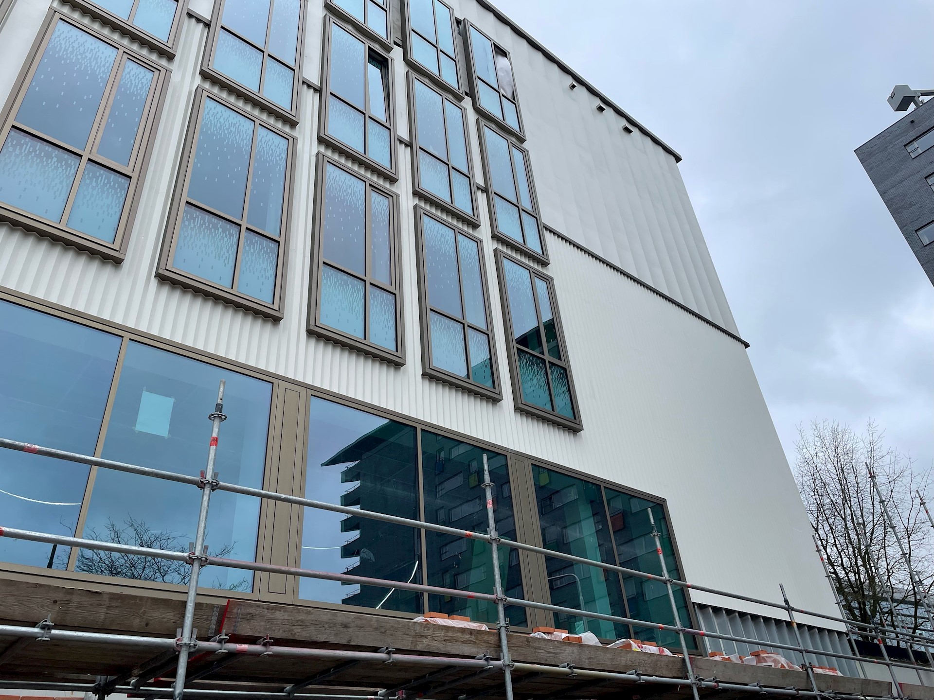 De nieuwbouw voor GGD Gelderland-Zuid in Nijmegen is inmiddels grotendeels uit de steigers! De door het werk van beeldend kunstenaar Jan Schoonhoven geïnspireerde gevelpatronen worden prachtig zichtbaar.
