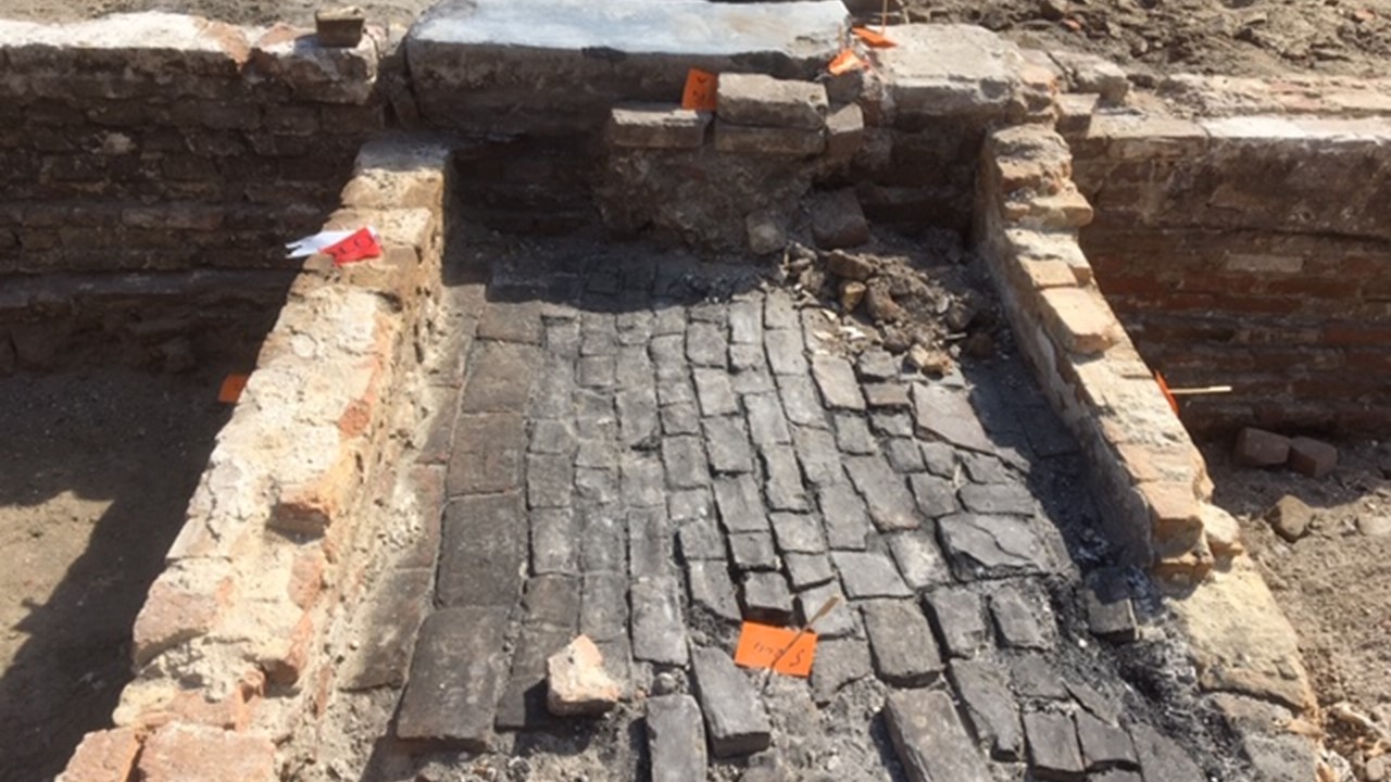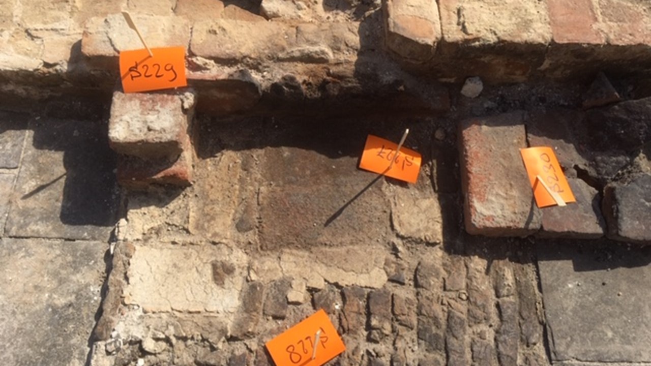 Binnenkort verrijzen er 9 stadsvilla’s aan de rand van het centrum van ’s-Hertogenbosch. Maar vorige week keken we op deze plek naar oude kademuren van de Dieze, een gemetselde toog met sluitsteen en het bruggetje over de steeg Achter de Mollen.