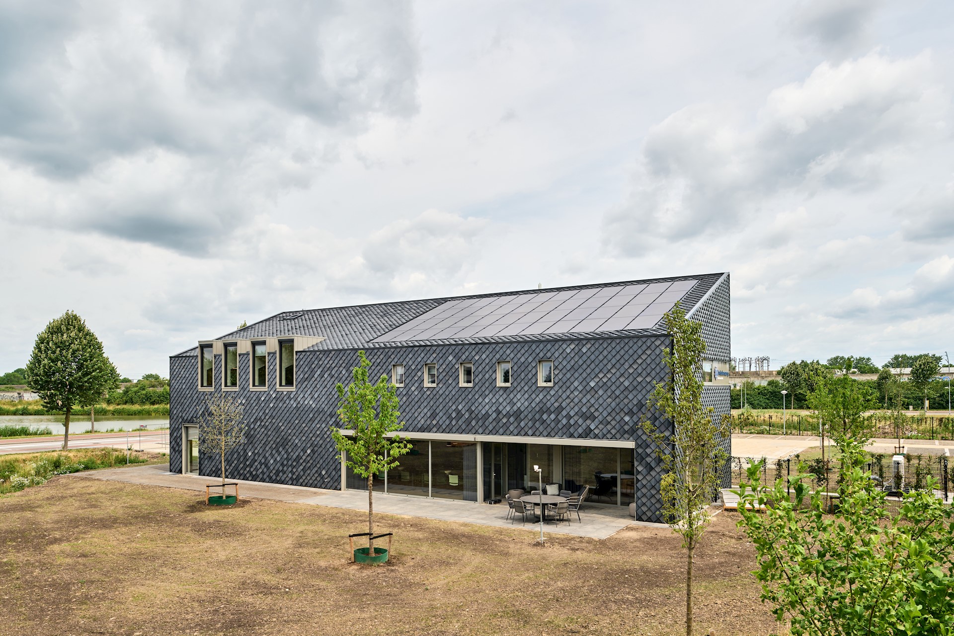 De grijze, ruitvormige tegels worden gemaakt van versnipperde PVC-bouwproducten, zoals raamkozijnen, regenpijpen en goten. De tegels worden in overlappende rijen eenvoudig met schroeven op het gebouw geïnstalleerd. Een groot voordeel van deze gevelbekleding is dat het volledig onderhoudsvrij is. Ook is het mogelijk de tegels te versnipperen en tot een nieuw product te persen. Zo blijven de Pretty Plastic-tegels dus ook ná gebruik in de ambulancepost een circulair product. We gebruiken de Pretty Plastic-tegels niet alleen als gevelafwerking, maar ook als dakleien. Dit is nog niet eerder gedaan en daarom een unieke stap. Doordat iedere tegel er net iets anders uitziet en de vorm van de tegel voor een fraai schaduwspel op de gevel zorgt, krijgt het geheel een natuurlijke en levendige uitstraling. De schuine kap op het kantoordeel zorgt voor een fraai accent en een herkenbaar en huiselijk beeld. Naast de prettige schaalsprong die het maakt naar de naastliggende boomgaard is het dak door de gunstige oriëntatie uitermate geschikt voor het integreren van zonnepanelen.
