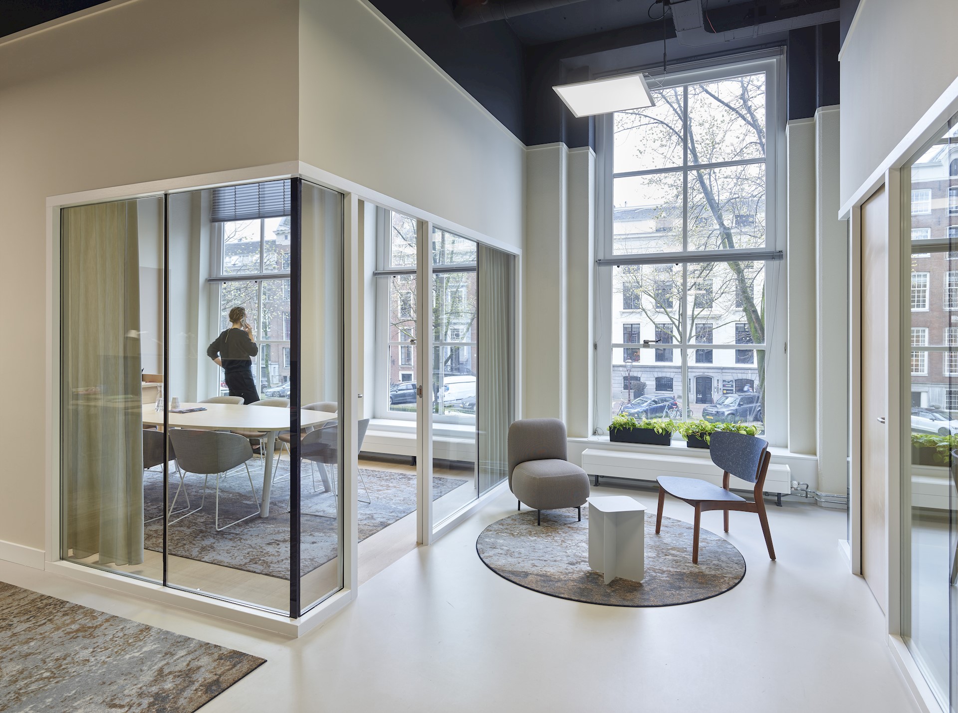 Zoals we dat in iedere kantooromgeving doen, is ook hier een zonering van dynamiek naar rust ontworpen. Gezien de karakteristieke, smalle vorm van het grachtenpand ligt deze zonering in verticale richting. Op de begane grond vinden we een dynamische omgeving, met daarin het werk-lunchcafé. Op de eerste verdieping heeft ontmoeting en samenwerken de overhand. Daar zijn verschillende grote vergaderruimtes te vinden. Op de tweede en derde etage liggen kantoorplekken voor geconcentreerd werken.
