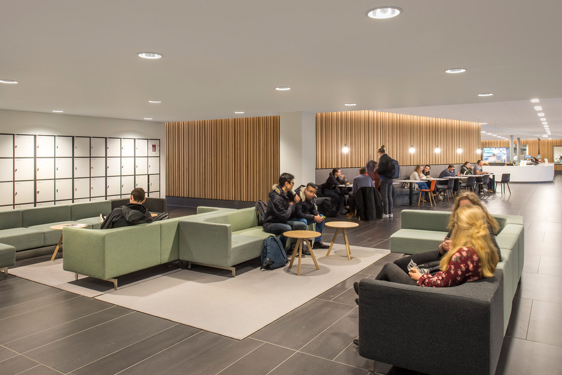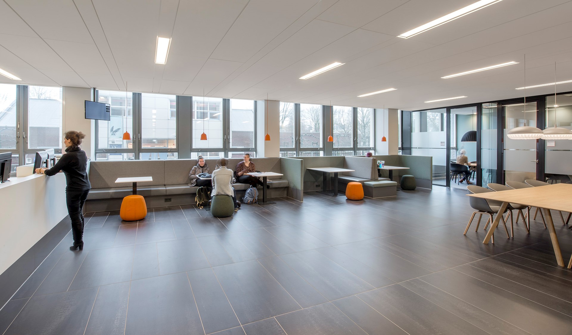 De belangrijkste ingreep was het ‘ontrommelen’ van de ruimte. De begane grond moest het verblijfs- en ontmoetingsgebied worden voor studenten, medewerkers en bezoekers, maar werd ervaren als gesloten en donker. Door wanden weg te halen ontstond een open en lichte omgeving met heldere zichtlijnen vanaf de hoofdentree tot aan het tweedelijns servicepunt achter in het gebouw, en vanaf de collegezalen tot buiten. Met het logisch ordenen van de stromen en het herinrichten van de ruimtes ontstond een optimale omgeving voor ontmoeting.