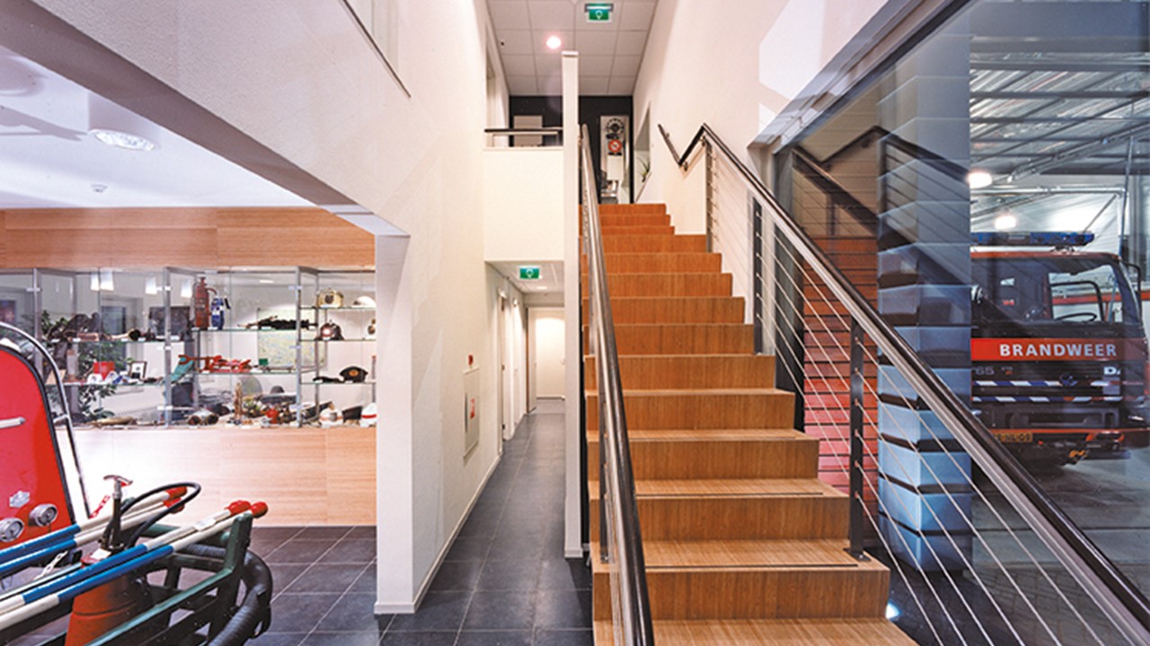BewarenBij het ontwerp van de nieuwe brandweerkazerne in Zaltbommel stond de logistiek van het uitrukken voorop. Bij een alarmoproep parkeren de vrijwilligers op het achterterrein, gaan achterom de garage in, schieten daar de uitrusting aan en rukken vervolgens ongehinderd uit. Het gebouw is bijzonder compact en efficiënt ingedeeld. Met de werk- en opslagruimten direct naast de stallingruimte, waarin vier voertuigen staan opgesteld, de instructieruimte en de kantine op de verdieping.