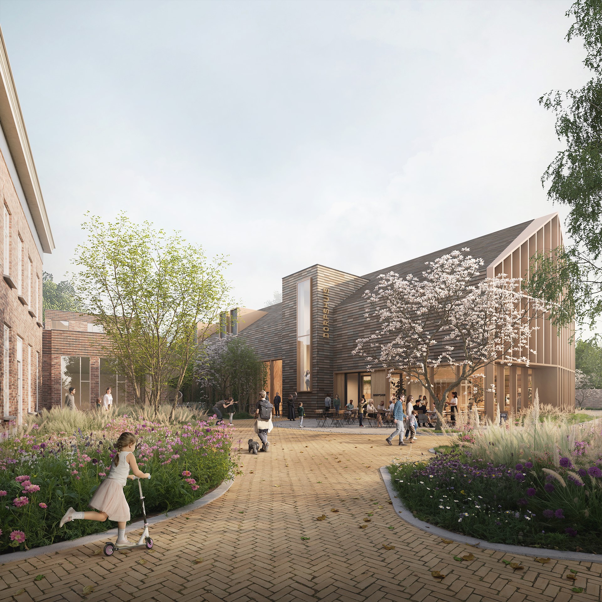 De vernieuwde multifunctionele accommodatie moest niet alleen optimaal aansluiten op de wensen van de gebruikers, maar ook op de bijzondere locatie in het dorp. We hebben veel aandacht besteed aan een mooie inpassing in het landschap met zicht op de omgeving, een uitnodigende entree en een levendig dorpsplein. De omgeving rondom het nieuwe complex zal worden heringericht om ontmoetingen te bevorderen in een groene setting, centraal gelegen tussen Kiosk, Kasteel en Klooster. Deze inrichting zal naadloos aansluiten op het dorpscentrum en het Witte Kasteel.