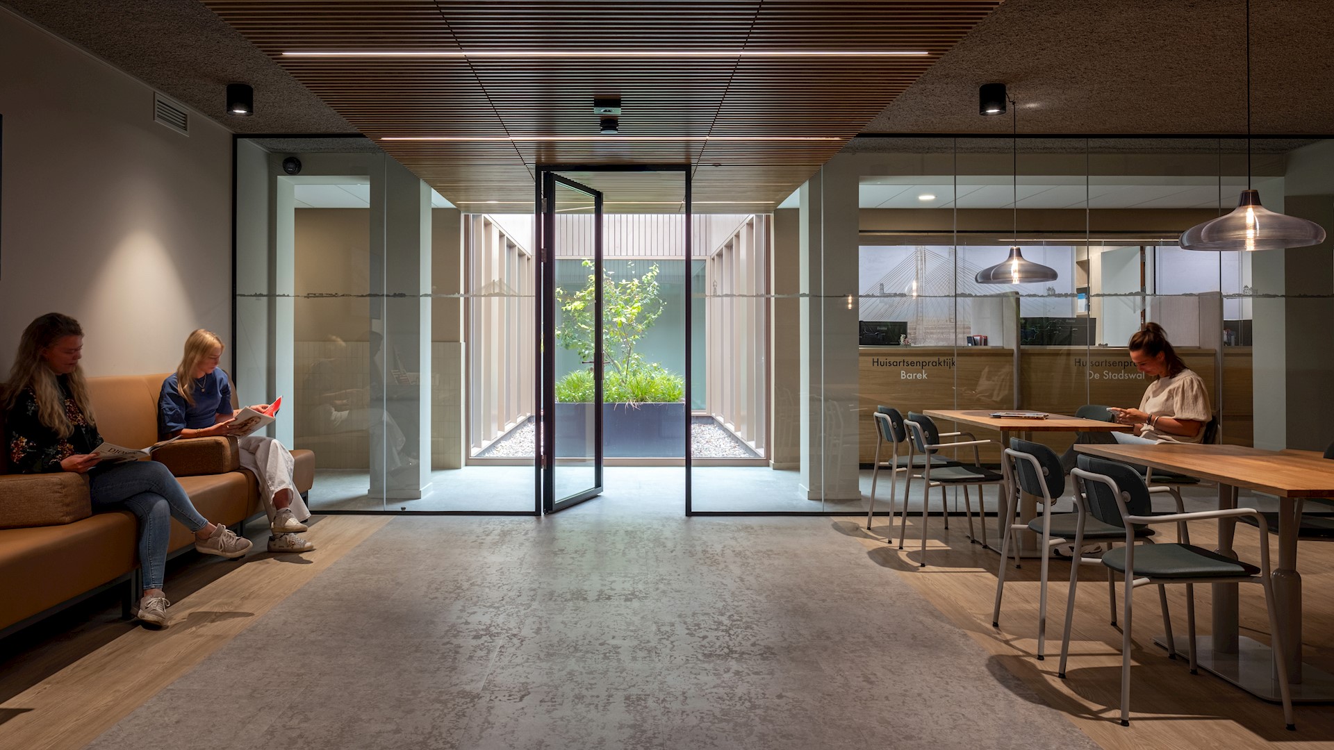 Deze ruimten zijn verbonden via een rondloop die door een accent in kleur en materiaal een uitgesproken karakter krijgt. De wachtruimte heeft warme materialen en een terughoudend kleurenpalet, wat een huiskamergevoel geeft. Bezoekers vinden vanuit daar eenvoudig hun weg naar de verschillende spreek- en behandelkamers.