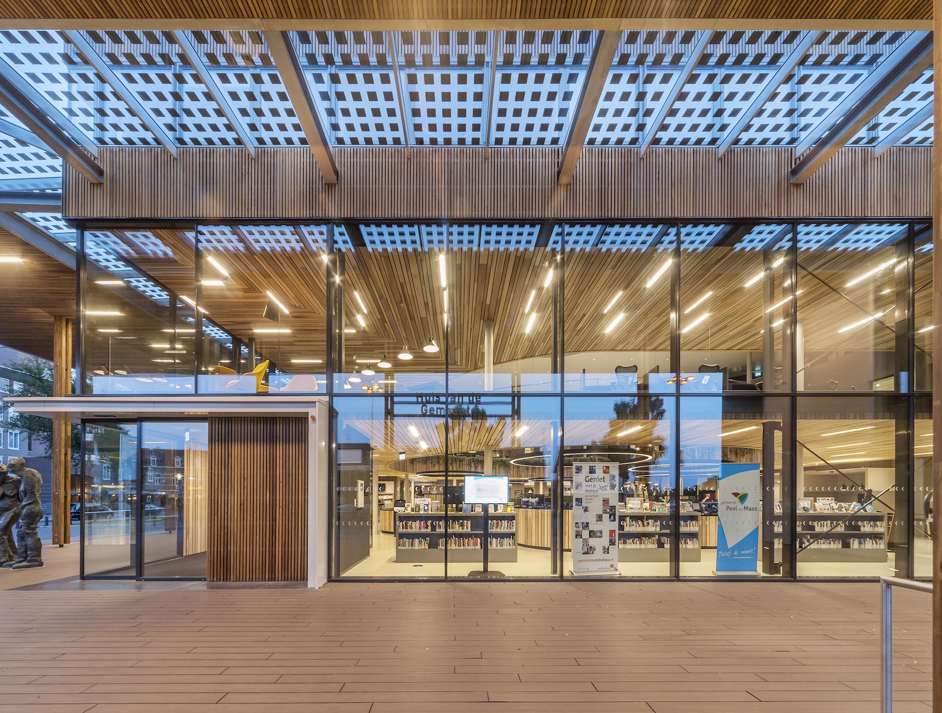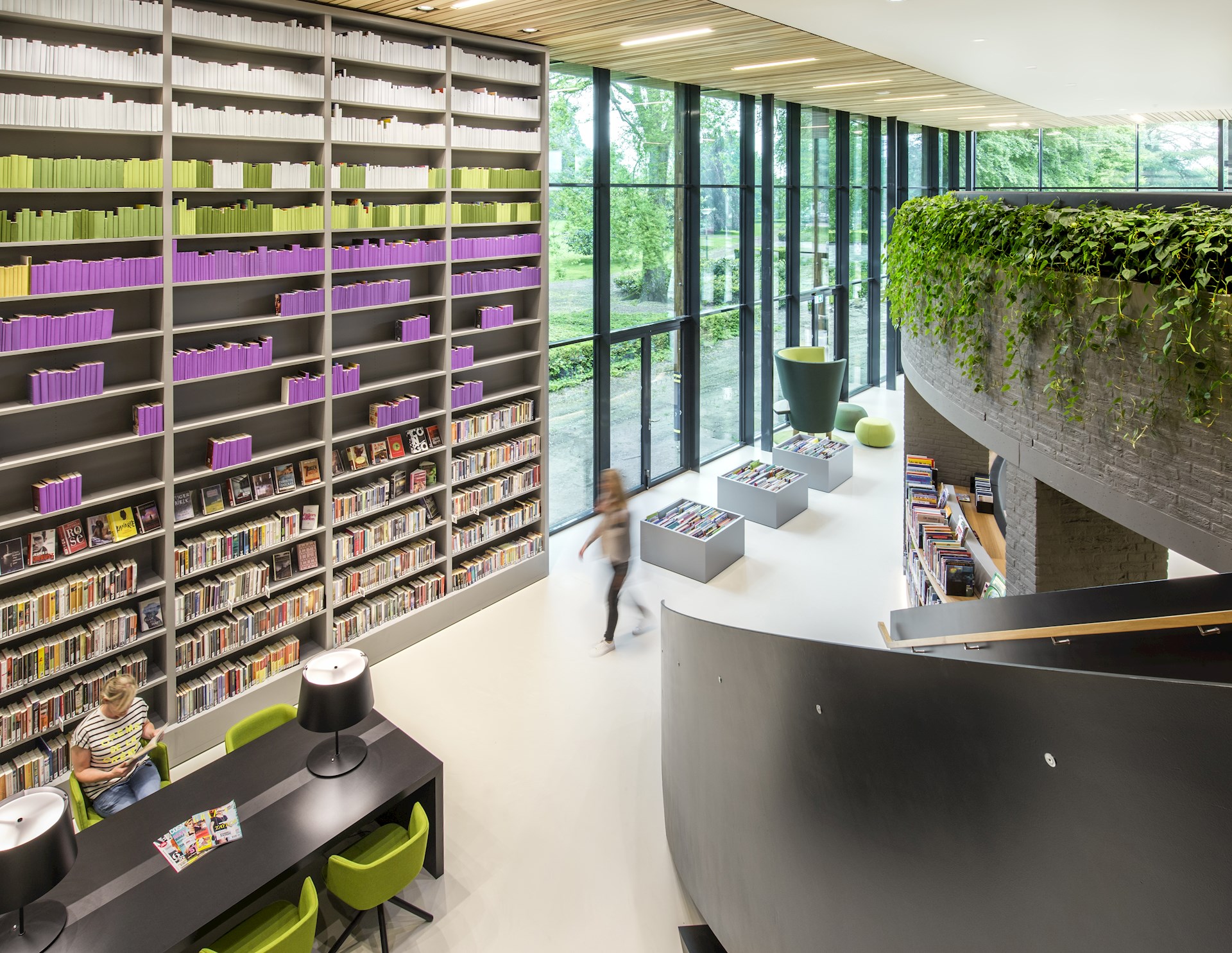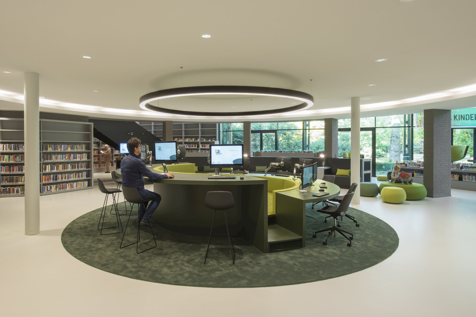 Op de begane grond loopt het openbare gebied vanaf de centrumzijde door naar de parkzijde. Hier liggen de functies van het KAC, de bibliotheek en ketenpartners verdeeld. Er zijn géén specifieke, eigen domeinen, maar de gebruiksgroepen zijn juist gemixt om zo optimale synergie te bereiken. Aan het openbare gebied liggen de multifunctionele ruimte en de creativiteitsversneller. De multifunctionele ruimte is middels taatsdeuren te combineren met de bedrijfskantine. De bedrijfskantine ligt op de begane grond in het privédomein en staat via een brede open trap in verbinding met de werkgebieden op de eerste verdieping.