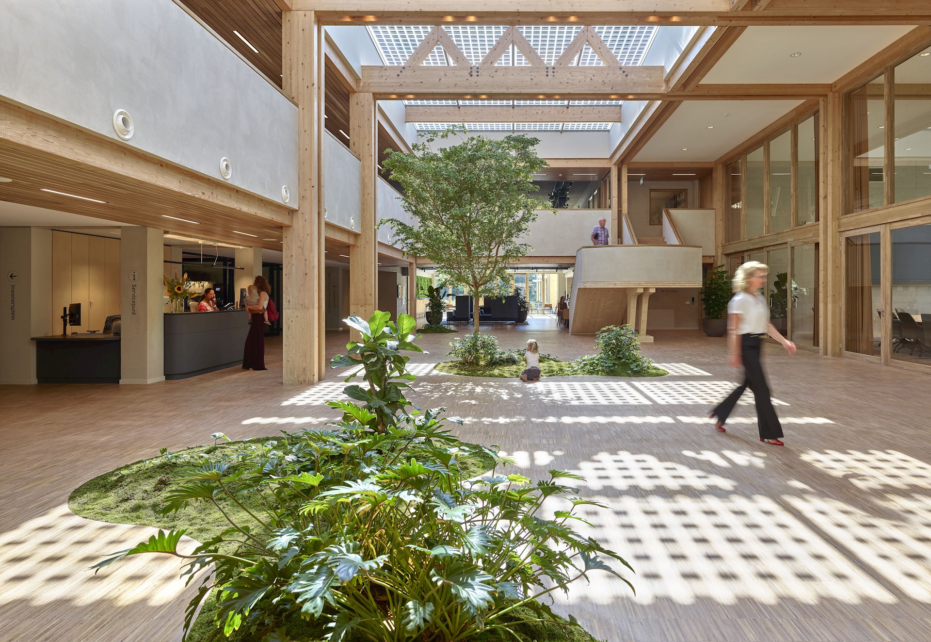 In het nieuwe ontwerp zijn we gaan voortborduren op de mooie structuur. Om een compacter volume te maken is het voorplein bebouwd met een constructie die precies aansluit op de constructieve lijnen van het oorspronkelijke gebouw. Vanuit de biobased gedachte is het gemaakt van gelamineerd hout. Binnenin wordt direct duidelijk welke onderdelen tot de oorspronkelijke constructie behoren en welke nieuw zijn. De bestaande constructie is nog meer dan vroeger zichtbaar en de nieuwe indeling is volledig afgestemd op de constructielijnen.