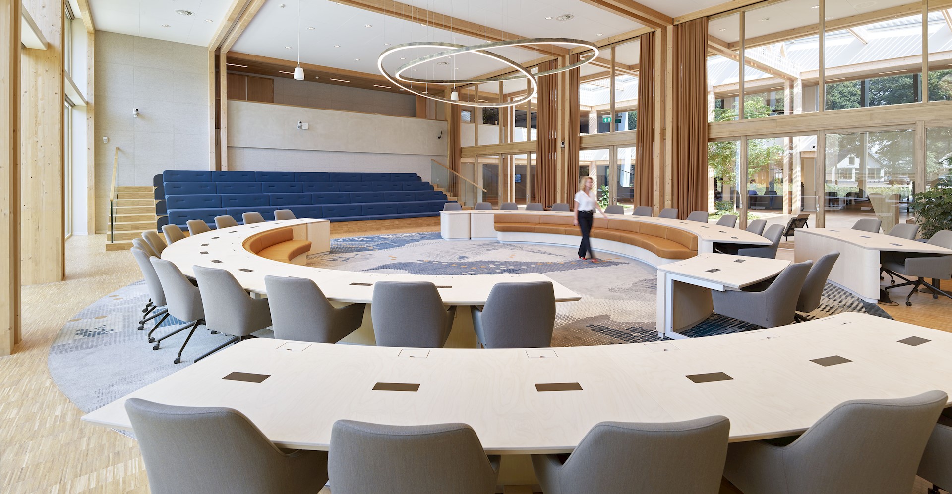 BewarenDe gemeente Voorst vroeg ons om een aantrekkelijk en uniek gemeentehuis te ontwerpen. Een gebouw dat niet zomaar een willekeurig kantoor, maar écht een Huis van de gemeente is. Het bestaande gebouw is begin jaren ’80 gerealiseerd en voldeed niet meer aan de huidige duurzaamheids- en comforteisen. Omdat het oude gemeentehuis wel een goede, constructieve structuur had, hebben we besloten deze betonnen constructie te handhaven. Verder is het gebouw helemaal circulair gestript tot het casco en opnieuw duurzaam opgebouwd. We hebben ernaar gestreefd om zoveel mogelijk materialen toe te passen die bij de productie ervan CO2 hebben opgevangen in plaats van hebben uitgestoten; zogenaamde biobased materialen.