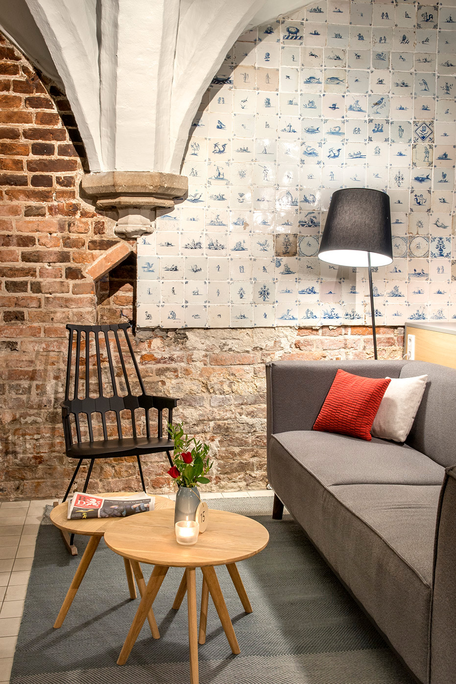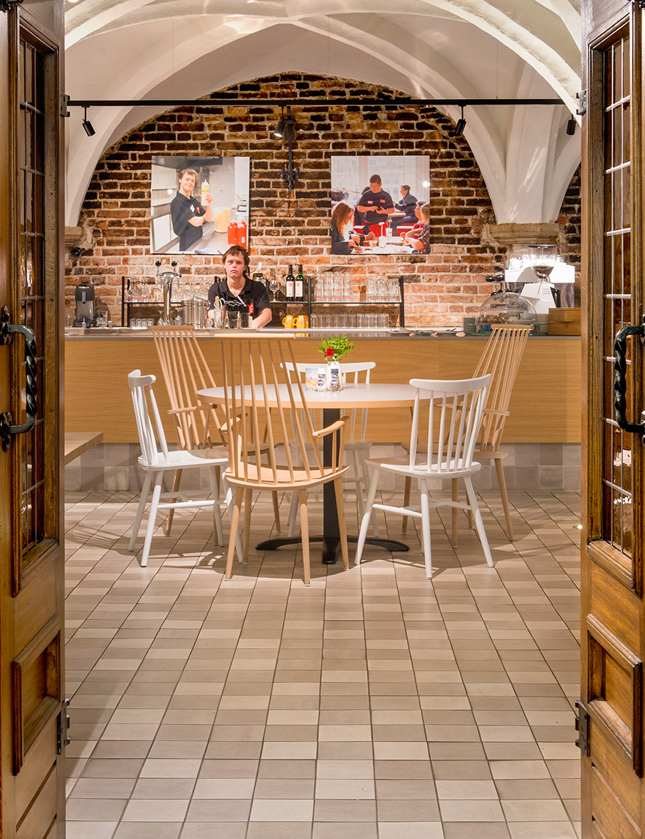 Er is gekozen voor een licht en modern interieur in contrast tot de historische ruimte met karakteristieke gewelven. Ook is er veel aandacht besteed aan verlichting zoals het aanlichten van de gewelven. Door de combinatie van deze elementen wordt het geheel een gezellige en prettige ruimte om in te verblijven voor zowel de bezoeker als het personeel.