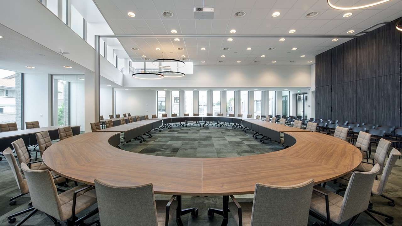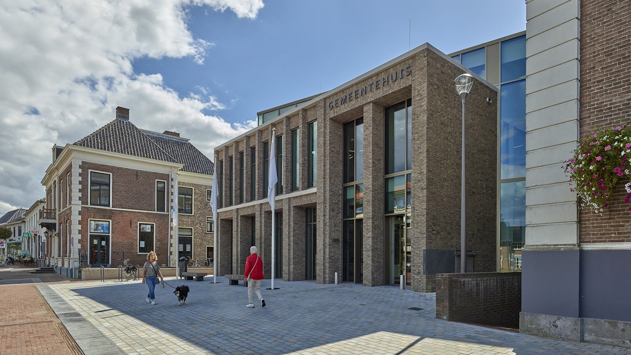 Na een uitgebreide analyse van het bestaande gebouw, ontwierpen wij een nieuwbouw dat het dynamische hart van het gemeentehuis vormt. Een nieuw ensemble, dat de bestaande bouwdelen (de kantoorvleugels, de bestuursvilla en de nieuwe publiekshal met daarboven de raadzaal) op een ruimtelijke manier met elkaar verbindt. Deze ruimtelijkheid versterkten wij door op de verdieping een nieuw vloerveld te realiseren, waarbij we de spreek- en vergaderruimtes op de begane grond plaatsten en op de verdieping een werk-lunchcafé met aanlandplekken. Door deze ingreep ontstond een prachtig hoog atrium in het hart van het gemeentehuis, met veel natuurlijke lichtinval.