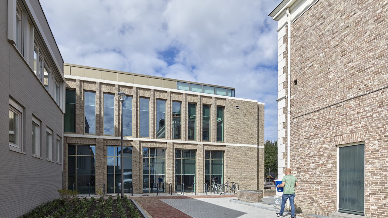 Er ontstaat een spel in plasticiteit doordat we de raadzaal, die op de verdieping ligt, een andere neggediepte gaven ten opzichte van de begane grond. Op deze manier creëren we vanuit verschillende perspectieven steeds een nieuw en boeiend zicht op de gevel. Doordat de gevel gelezen kan worden als een stapeling van colonnades, krijgt deze een klassiek-moderne, tijdloze uitstraling. De kozijnen zijn fraai slank geprofileerd, gemaakt van aluminium in een bronsachtige anodiseerkleur. De entree positioneerden we bewust aan de zijkant van de metselwerkgevel. Op deze manier is deze gesitueerd in het nieuwe hart van het gemeentehuis, bestaande uit het ensemble van zowel de nieuwbouw als het bestaande gebouw.
