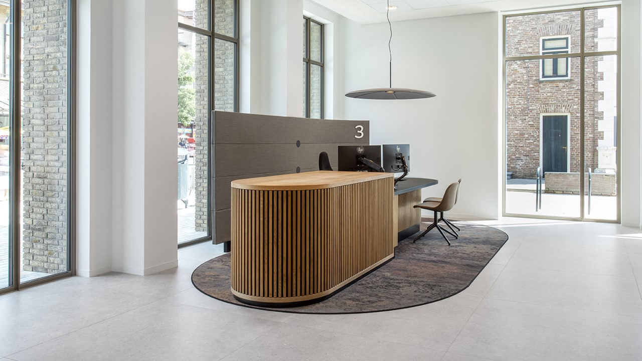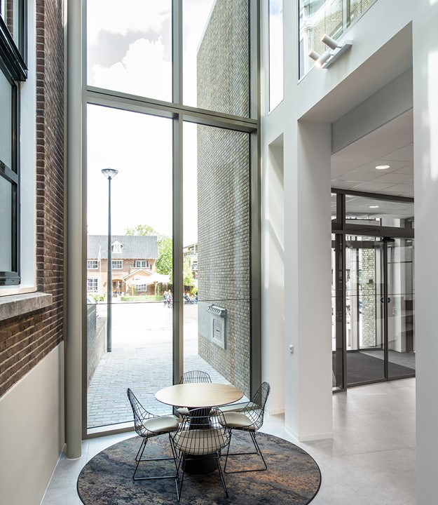 Bij binnenkomst betreedt de bezoeker een ruimtelijke hal. Een gemoedelijke ontmoetingsplek, vergelijkbaar met de sfeer van een marktplein: dynamisch, open, licht en levendig. Door een heldere positionering van de verschillende functies, weet de bezoeker direct de weg te vinden naar de juiste plek. Via een uitnodigende receptie wordt de bezoeker verder het gebouw in geleid. Passend bij de dynamiek van de hal is het publieksdomein niet star opgebouwd. Integendeel, we creëerden juist een diversiteit aan spreekplekken, variërend van de snelservice balie en open informele overlegplekken bij de entree tot afgeschermde spreekruimtes voor privacygevoelig overleg. Korte of lange besprekingen, wel of geen behoefte aan privacy, informeel of juist meer zakelijk: voor elk soort overleg is er nu een geschikte ruimte.