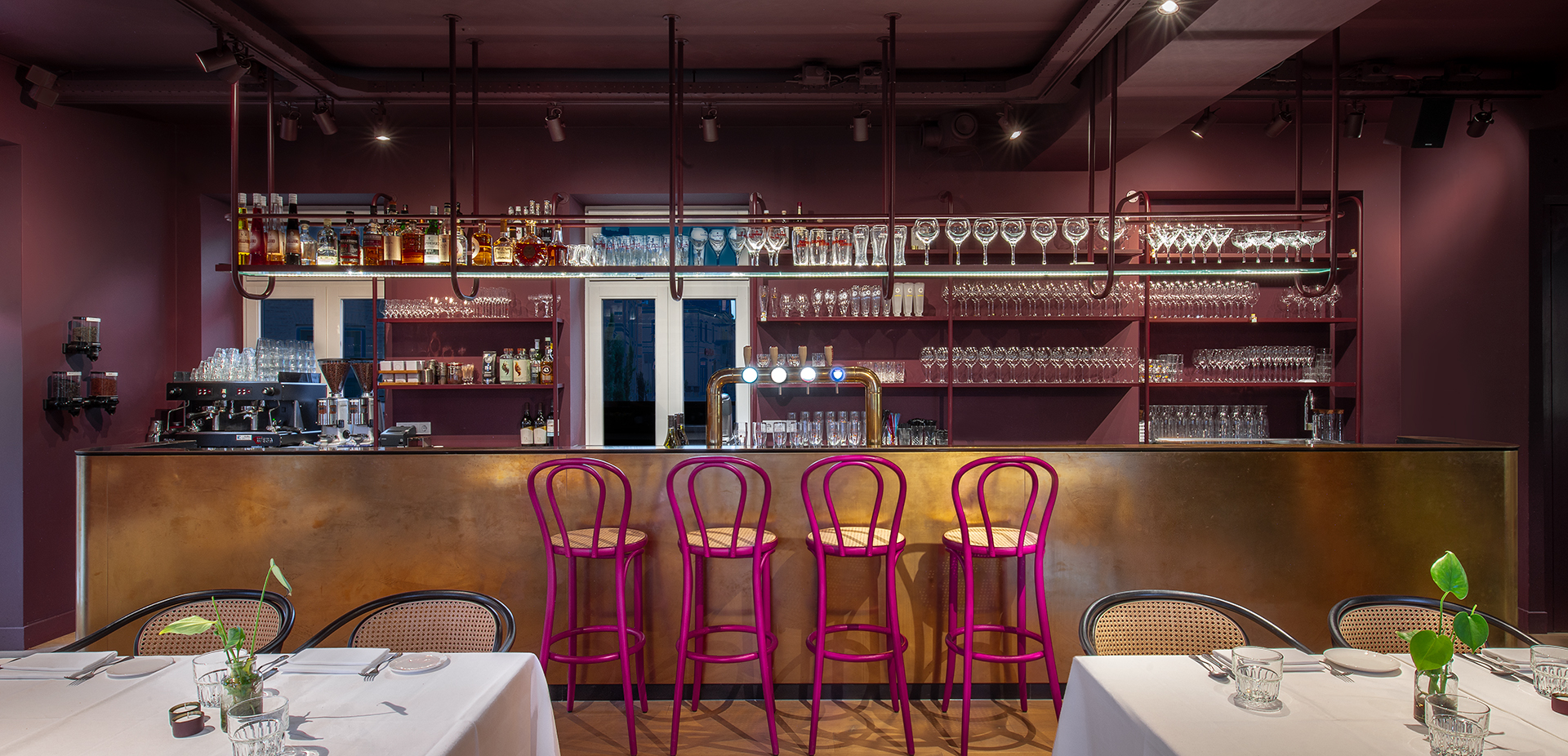 We wilden in Sukerieje een intieme sfeer creëren die elegant en stoer tegelijk is, met een knipoog naar de klassieke uitstraling van de horeca in het begin van de 20e eeuw. De auberginegekleurde wanden en plafonds, in combinatie met de eikenhouten vloer, geven het interieur een diepe, warme toon. Deze kleuren resoneren op hun beurt heel mooi in het elegante geelkoper van de lange messing bar op de begane grond en de bar op de verdieping.