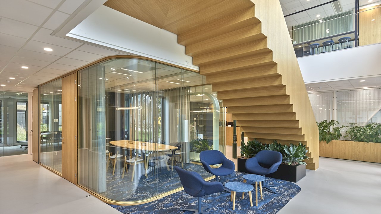 De Office ligt in het Paleiskwartier; een relatief nieuw stukje ’s-Hertogenbosch, dat de afgelopen jaren in hoog tempo is ontwikkeld. Om in het strakke kantoorpand een warme werkomgeving te creëren, hebben we het gevoel van enerzijds de bourgondische binnenstad en anderzijds de Bossche natuur naar binnen gehaald. Zo zijn elementen uit ‘s-Hertogenbosch verwerkt in de opbouw, zonering, sfeer en uitstraling van de verschillende verdiepingen. Daardoor heeft het voorheen vrij anonieme kantoorpand nu écht een eigen identiteit.