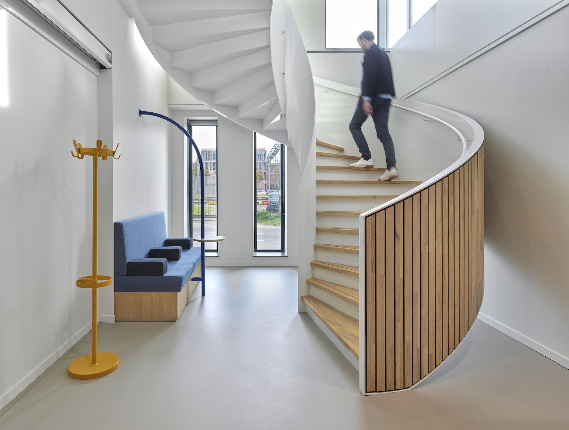 Constructief was de verbouwing en inrichting van De Office een uitdagende opgave. De grootste ingreep was de realisatie van een volledig open trapverbinding die reikt van de eerste tot en met de zesde verdieping. Hiervoor hebben we een grote vide ontworpen. Deze zorgt voor goede zichtlijnen en sociale samenhang. Daarnaast dient deze vide als beveiligingsmaatregel met tourniquet. Door het creëren van de vide komt er tevens meer daglicht het gehele pand binnen. Bijkomend voordeel is het fraaie uitzicht over de stad dat je krijgt vanaf de trap.