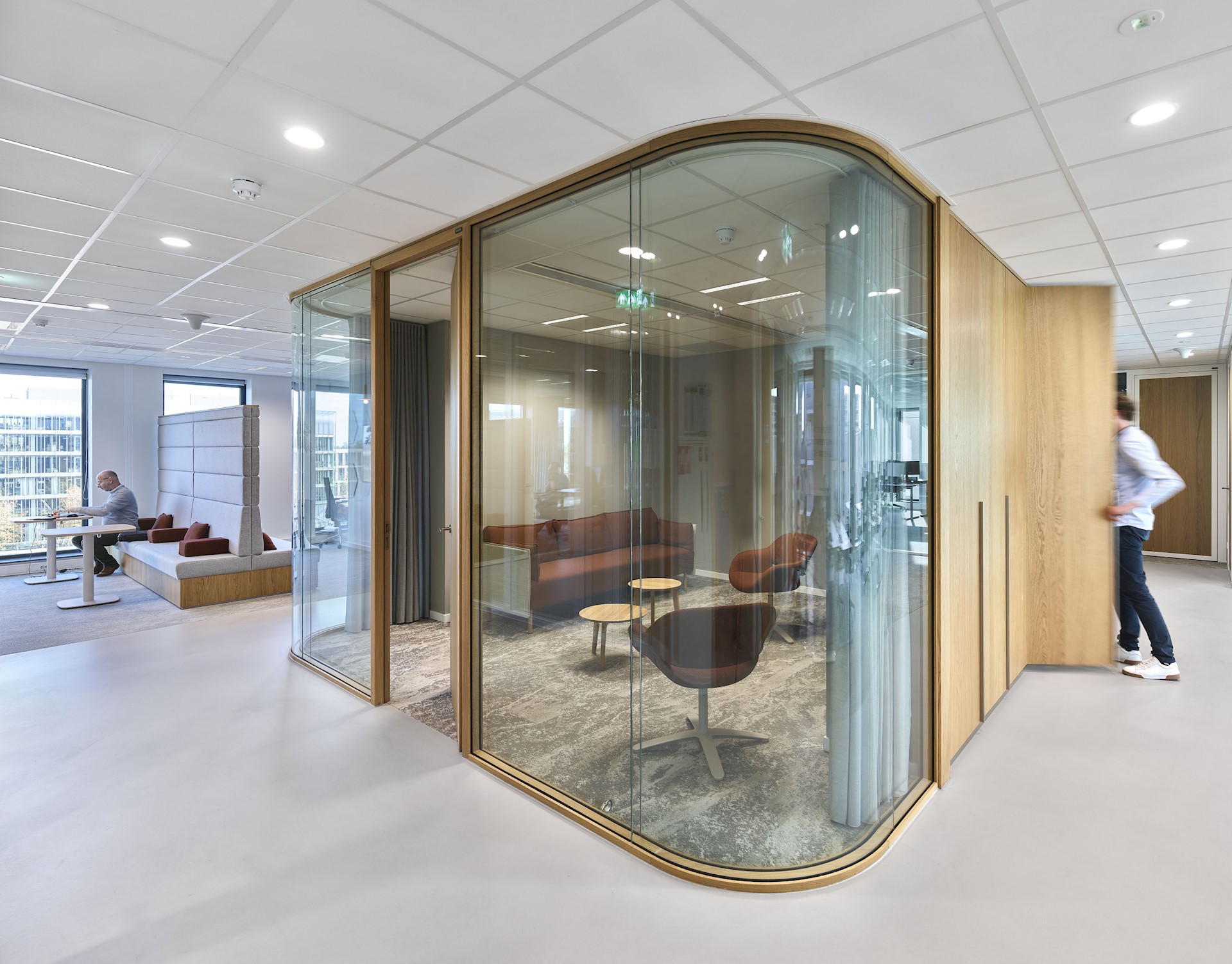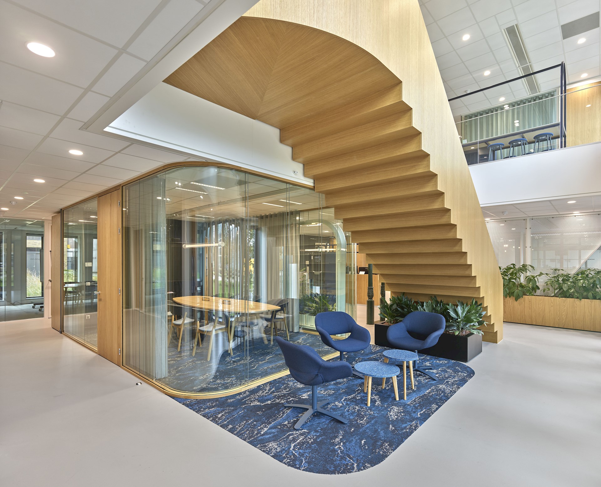 Op iedere verdieping liggen aan de vide dynamische ontmoetingsplekken waar medewerkers iets drinken, even bijpraten of kort overleggen. Vanuit daar lopen medewerkers de kleine vergaderruimtes in. Het interieur van de sfeervolle vergaderruimtes heeft een moderne vormgeving, geïnspireerd op een bruin café. Gevarieerd ingericht met een breed scala aan vergadermogelijkheden zijn er ruimtes met lage en hoge vergadertafels, een ‘huiskameropzet’ en/of scrumvoorzieningen. Deze vormen een buffer naar de rustige werkzones.