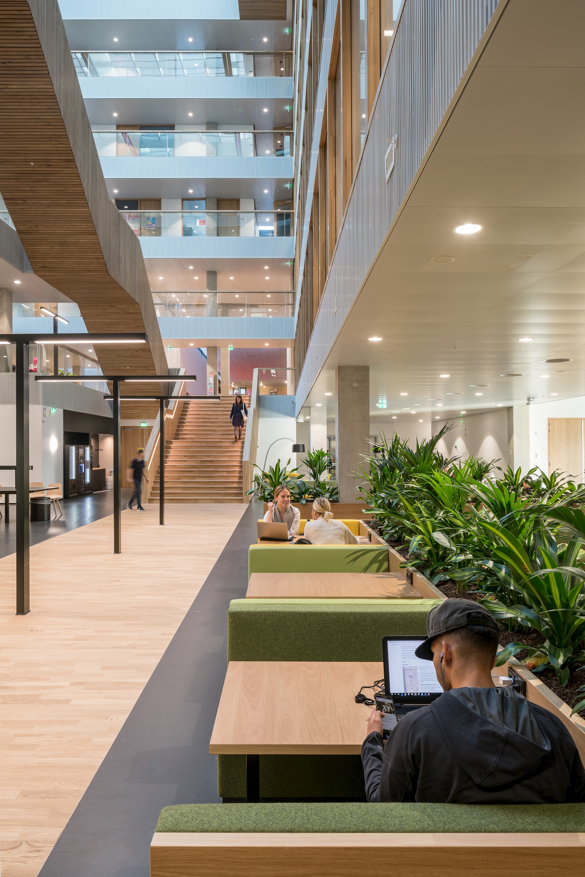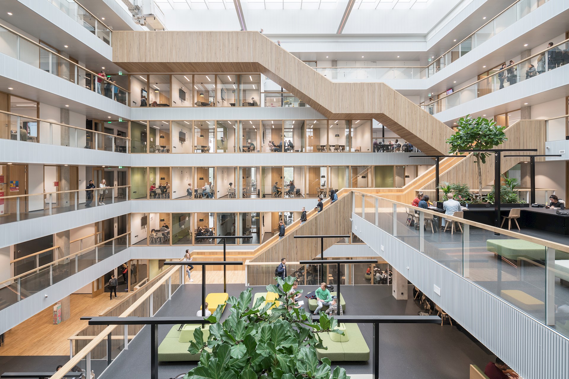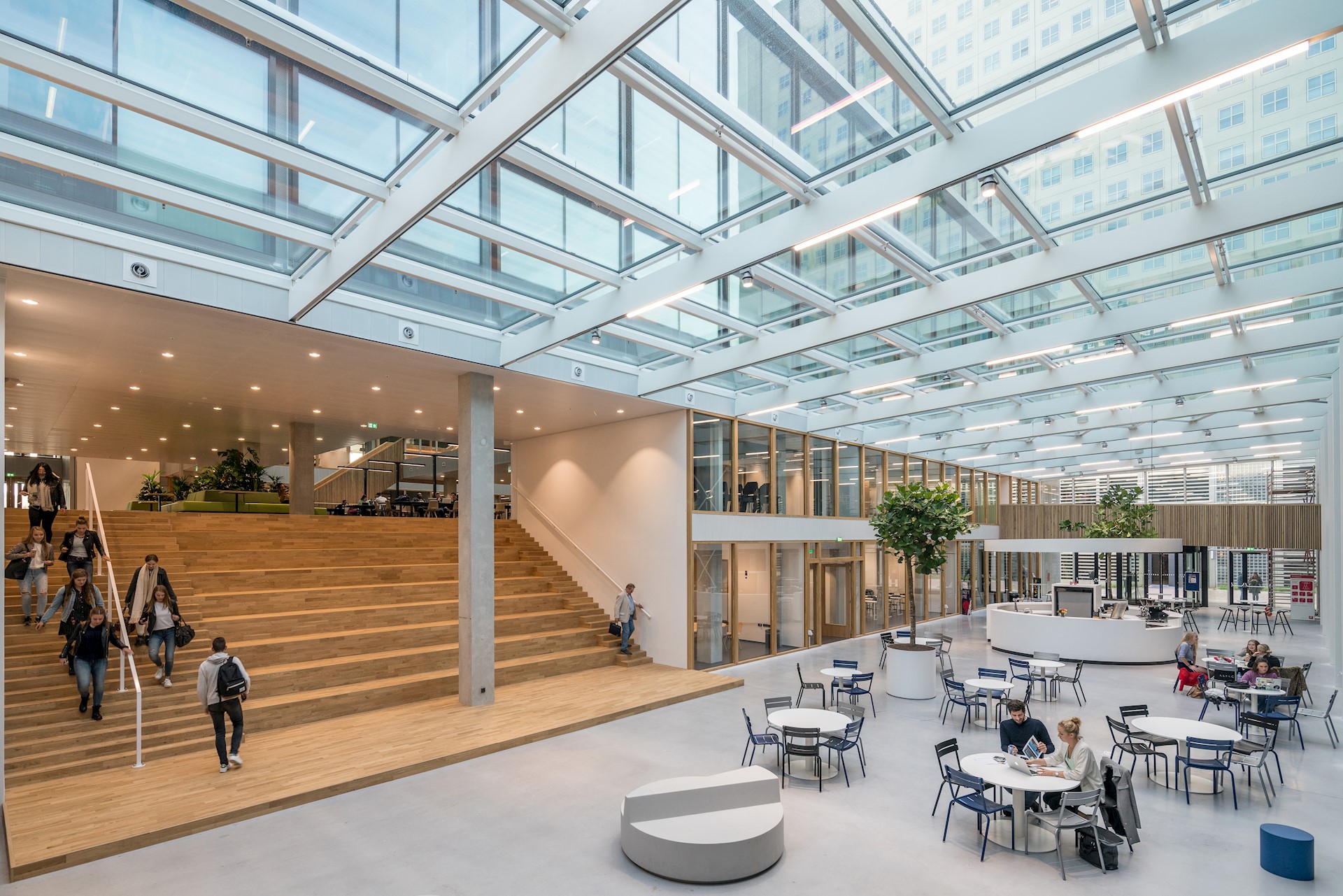 De bestaande studiestraat is doorgetrokken tot aan de ingang van de nieuwbouw, waar deze zich opent via een entree met brede podiumtrap. De studiestraat is voorzien van een koffiebar en flexibel meubilair, wat deze geschikt maakt voor informele ontmoetingen en evenementen. De 20 meter brede trap geeft toegang tot het lichte hart van het nieuwe onderwijsgebouw, het atrium. Rondom het atrium zijn projectruimtes, leslokalen en kantoren gesitueerd. In het atrium bevinden zich op elke verdieping studiepleinen verbonden met een uitgesproken en uitnodigende houten trap.