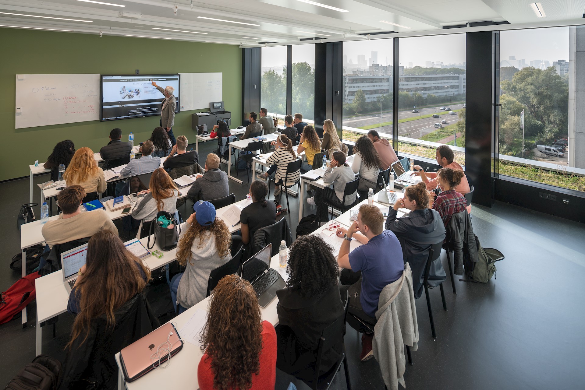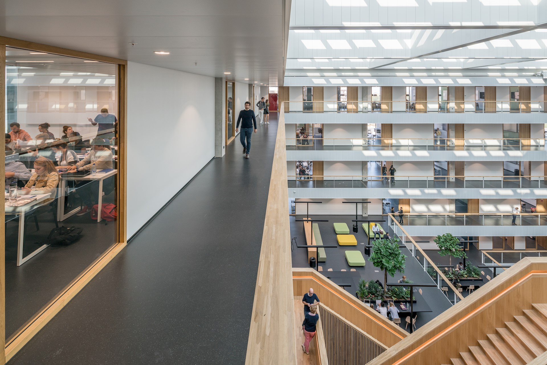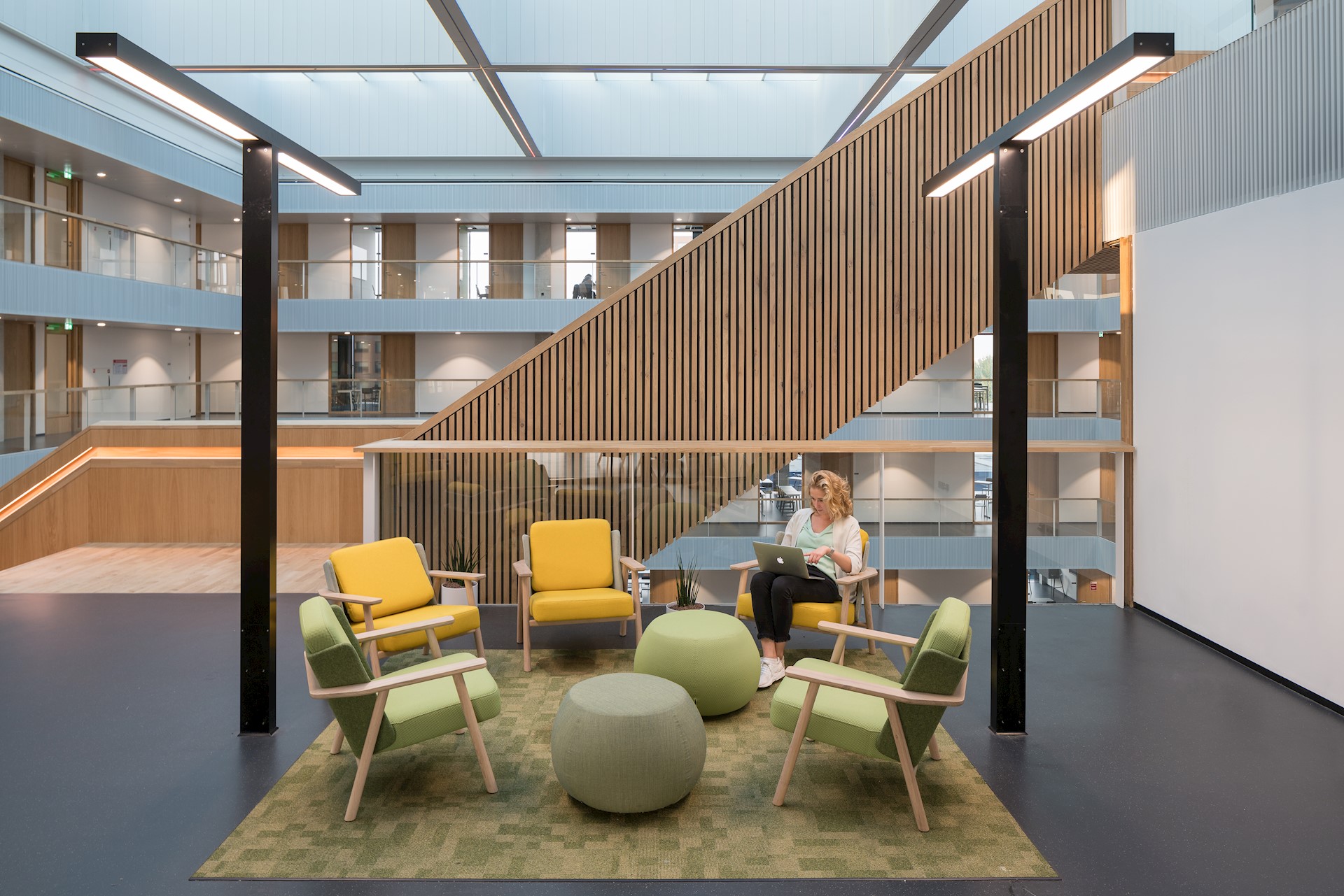 De bestaande studiestraat is doorgetrokken tot aan de ingang van de nieuwbouw, waar deze zich opent via een entree met brede podiumtrap. De studiestraat is voorzien van een koffiebar en flexibel meubilair, wat deze geschikt maakt voor informele ontmoetingen en evenementen. De 20 meter brede trap geeft toegang tot het lichte hart van het nieuwe onderwijsgebouw, het atrium. Rondom het atrium zijn projectruimtes, leslokalen en kantoren gesitueerd. In het atrium bevinden zich op elke verdieping studiepleinen verbonden met een uitgesproken en uitnodigende houten trap.