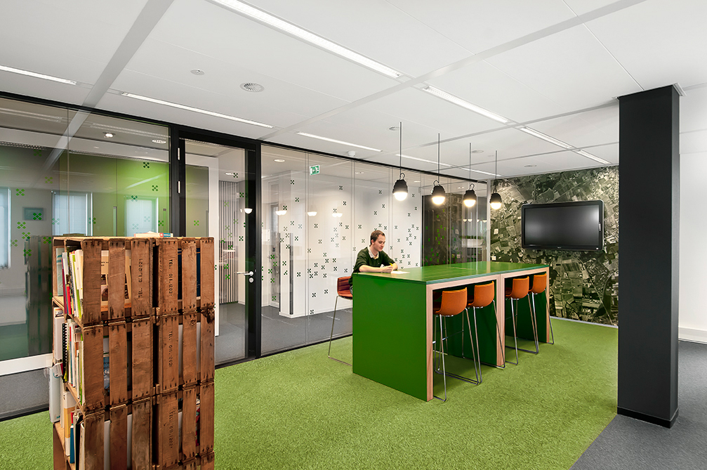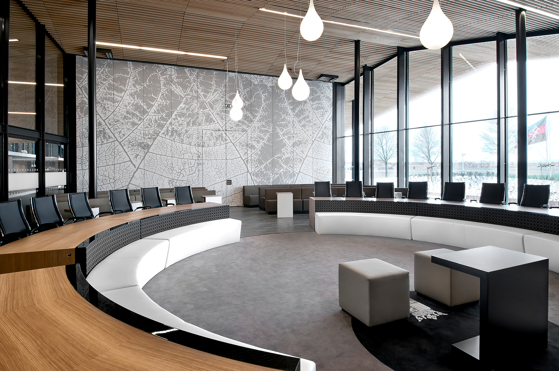 Aan de noordzijde grenst het complex aan een wijds, groen gebied, een omgeving waarin hier en daar grote boerderijen met grote kapconstructie liggen. Deze grote kappen zijn als ontwerpthema gebruikt voor de grote, centrale ontmoetingshal. Hiermee is het gemeentehuis verankerd in de lokale identiteit. Ook aan de binnenzijde van de hal is deze kapvorm duidelijk zichtbaar gemaakt. De ruimte heeft een totaal transparante noordgevel, waardoor een optimale relatie tussen ontmoetingshal en het landschap wordt gerealiseerd. De grote kap is afgedekt met een groen sedumdak.