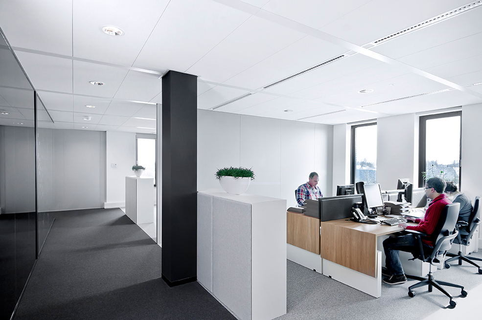 De puien in de voorgevel en de binnenzijde van dit dak zijn van blank hout waardoor een prettige, warme sfeer ontstaat. Om het uitnodigende karakter vanuit de noordzijde extra te benadrukken zijn door de verschuivingen in het kantoorblok een tweetal patio’s ontwikkeld. Hierdoor kan het daglicht tot diep in het centrale deel doordringen en zodoende als extra trekker werken. Om het ontmoetingsgedeelte extra kracht te geven is voor het kantoorgedeelte bewust gekozen voor een nagenoeg zwarte baksteen. Ook de verticale lichtstroken zijn voorzien van donkere kozijnen.