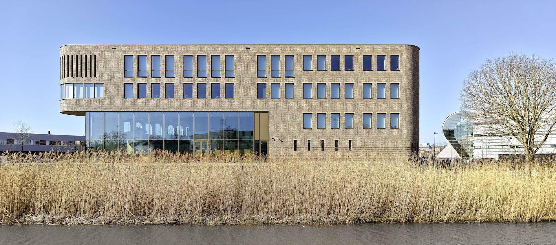 Het nieuwe gebouw is als een echte eenheid vormgegeven, met gebruik van hoogwaardige materialen en detaillering. Het volledige exterieur is uitgevoerd in een handvorm baksteen met een warme kleur. Door de verspringende voegdiepten heeft het metselwerk een mooie tactiliteit, waarbij er door de verschillen in schaduwval ogenschijnlijk kleurverschillen ontstaan. Ook bijzonder is dat dit metselwerk is uitgevoerd in een Noors kettingverband; elke laag bestaat uit een herhaling van twee strekken met één kop. De posities van de ramen, met slanke, brons geanodiseerde aluminium kozijnen zijn daar vervolgens speciaal op afgestemd. De hoeken met de diepe neggen moesten namelijk goed ingepast worden in dit verband. Hierbij moesten we ook rekening houden met een ander programmatisch uitgangspunt; om een flexibel gebouw te creëren, hebben we er namelijk voor gezorgd dat op elke 1,80 meter een binnenwand kan worden geplaatst. Zo zijn de ramen volgens een zeer specifieke ordening in de gevel geplaatst, waardoor het typische gevelpatroon is ontstaan.