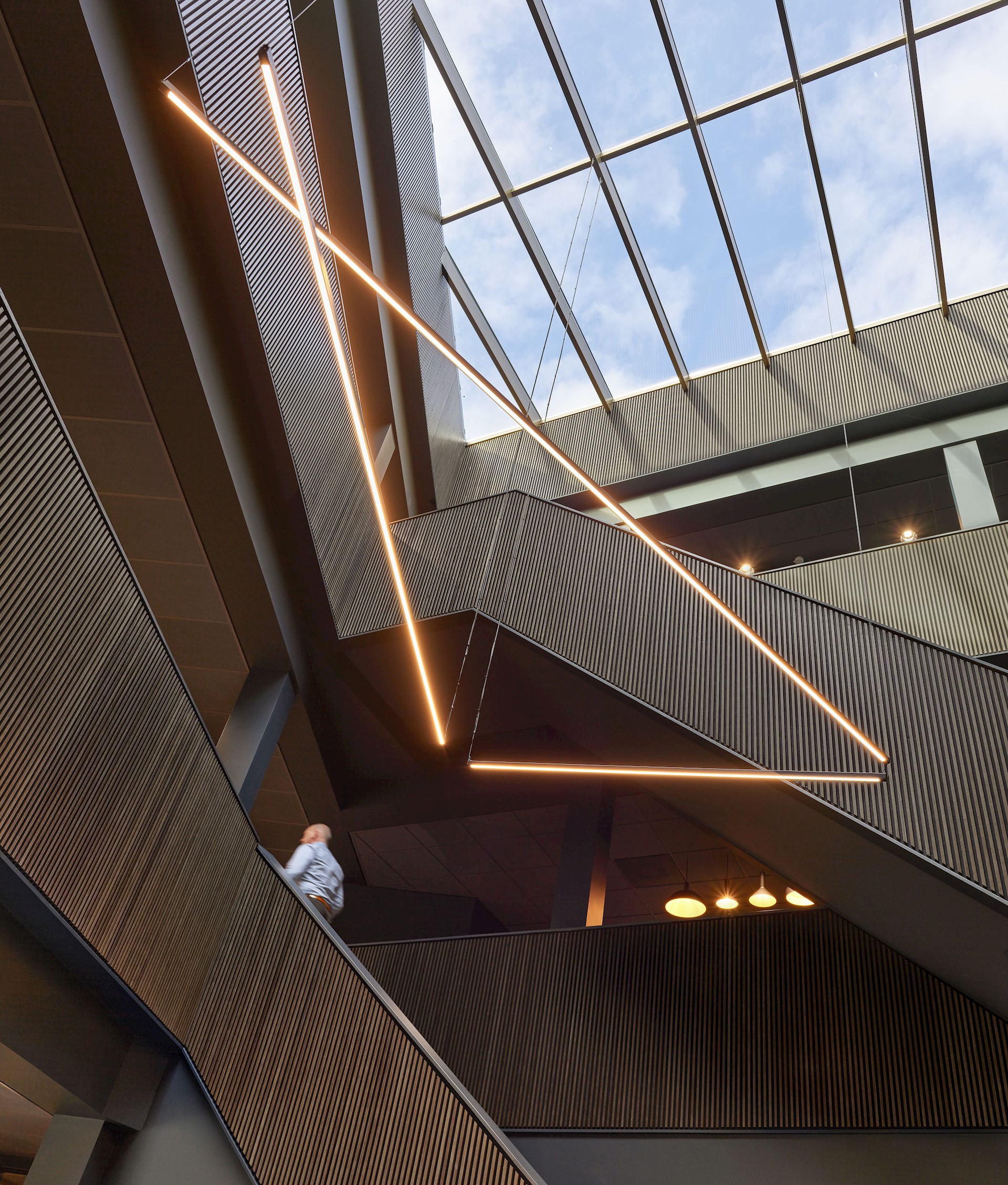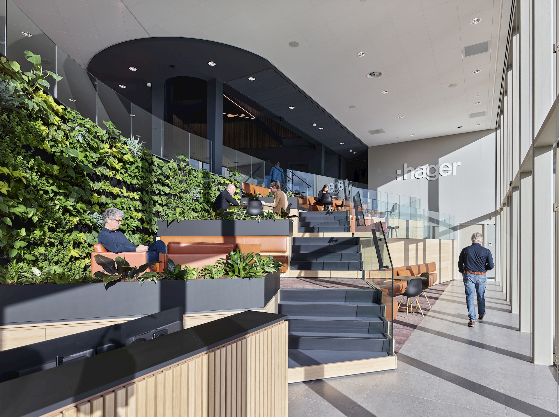 Om ervoor te zorgen dat het nieuwe gebouw écht bij Hager past, hebben we door materialisatie en kleurgebruik de identiteit van de opdrachtgever in het interieur zichtbaar gemaakt. Hager wilde graag een ‘warm’ en toegankelijk pand met een informele en gemoedelijke sfeer, zowel in het publieke als het werkgebied. De warme kleuren die wij hiervoor in het interieur hebben toegepast, zijn afgeleid van koper. Dit materiaal vormt voor Hagers elektrotechnische producten de verbinder. De kopertinten zijn als leidraad genomen en daarmee nu ook de verbinder in het interieur. Zowel de binnen- als de buitenzijde van de driehoekige kern is uitgevoerd in houten latten met een donkere accentkleur, waardoor overal in het gebouw de ervaring van het hout aanwezig is. Aan de zijde van de gevel is er voornamelijk gebruikgemaakt van hout in een lichte tint.
