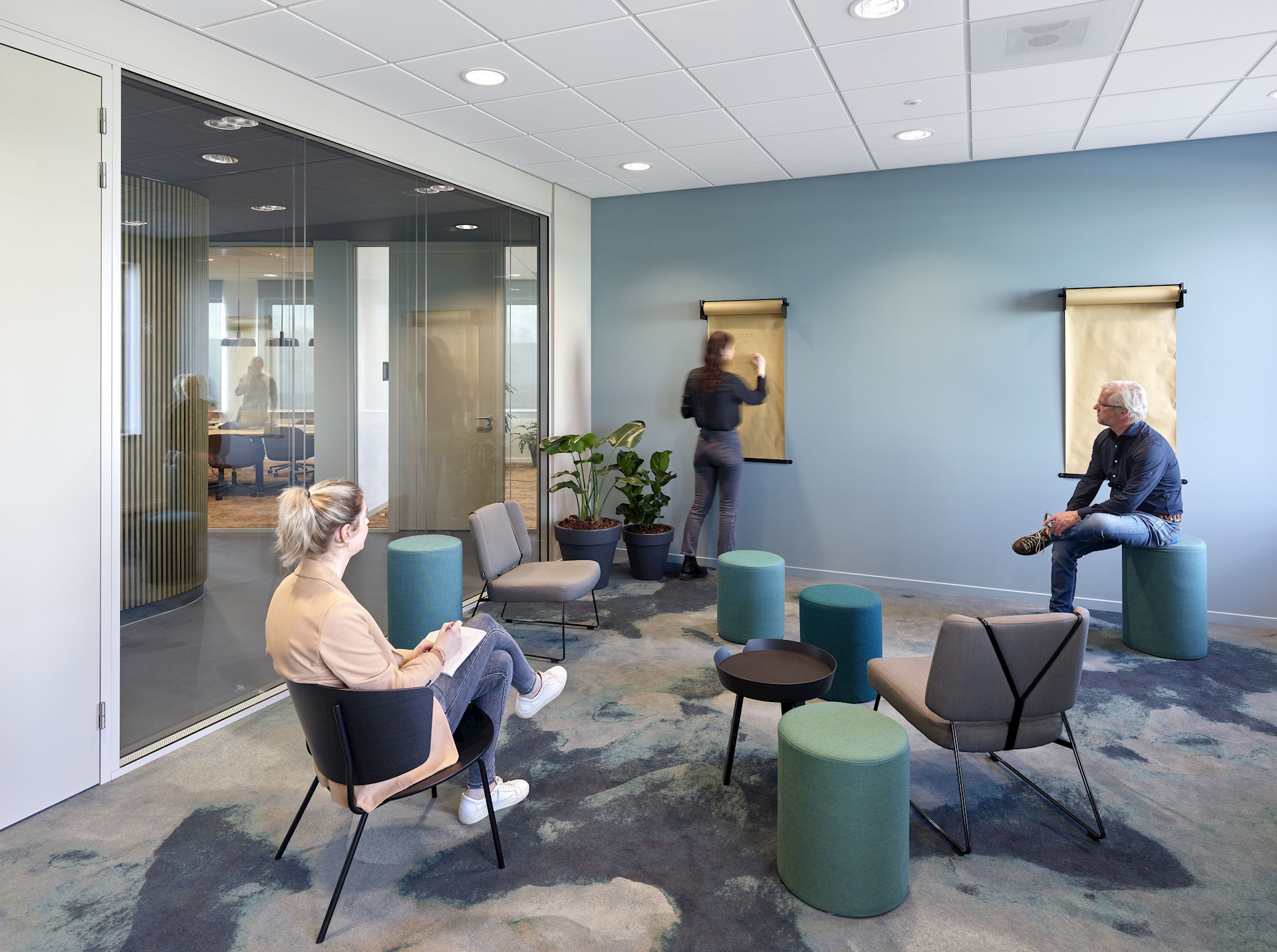 De werkplekken op de tweede en derde verdieping zijn ontworpen als hybride en gezonde werkomgeving. Deze zijn te betreden via de fraaie trappen in de vide. Personeel kan hier op ieder moment kiezen voor bijvoorbeeld een aanlandplek, open werkplek, samenwerkplek of scrumruimte. Doordat de werkplekken aan de gevel liggen, krijgen deze altijd genoeg daglicht. Ook is er een daily start up punt gerealiseerd en kan er in de gebouwkern worden gekozen voor een concentratiecocon. Door een combinatie van PET-vilt en houten latten als plafond- en wandafwerking heeft de werkomgeving een optimale akoestiek. Beweging wordt gestimuleerd door de prominente trappen in de vide en het op sommige punten bewust weglaten van krukken bij hoge tafels. Na de komst van het coronavirus hebben we snel geschakeld en de verschillende werkplekken aangepast voor een optimale inzet van digitale schermen en camera’s. Ook zijn de ronde tafels vervangen door tafels in trapeziumvorm, zodat een team gemakkelijk naar een scherm kan kijken.