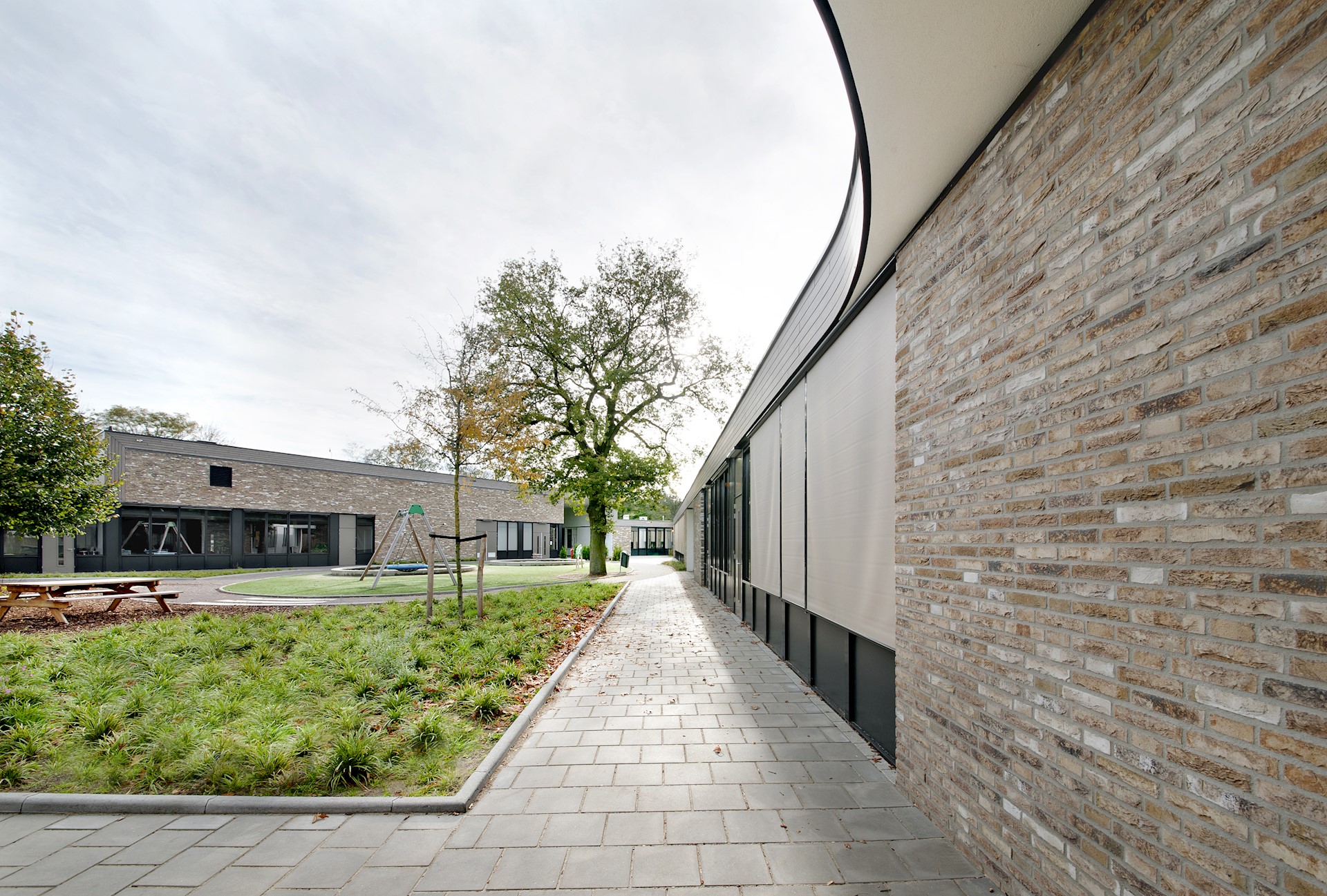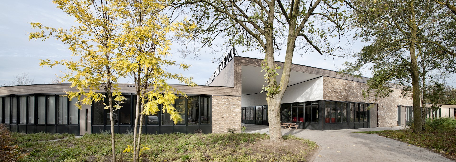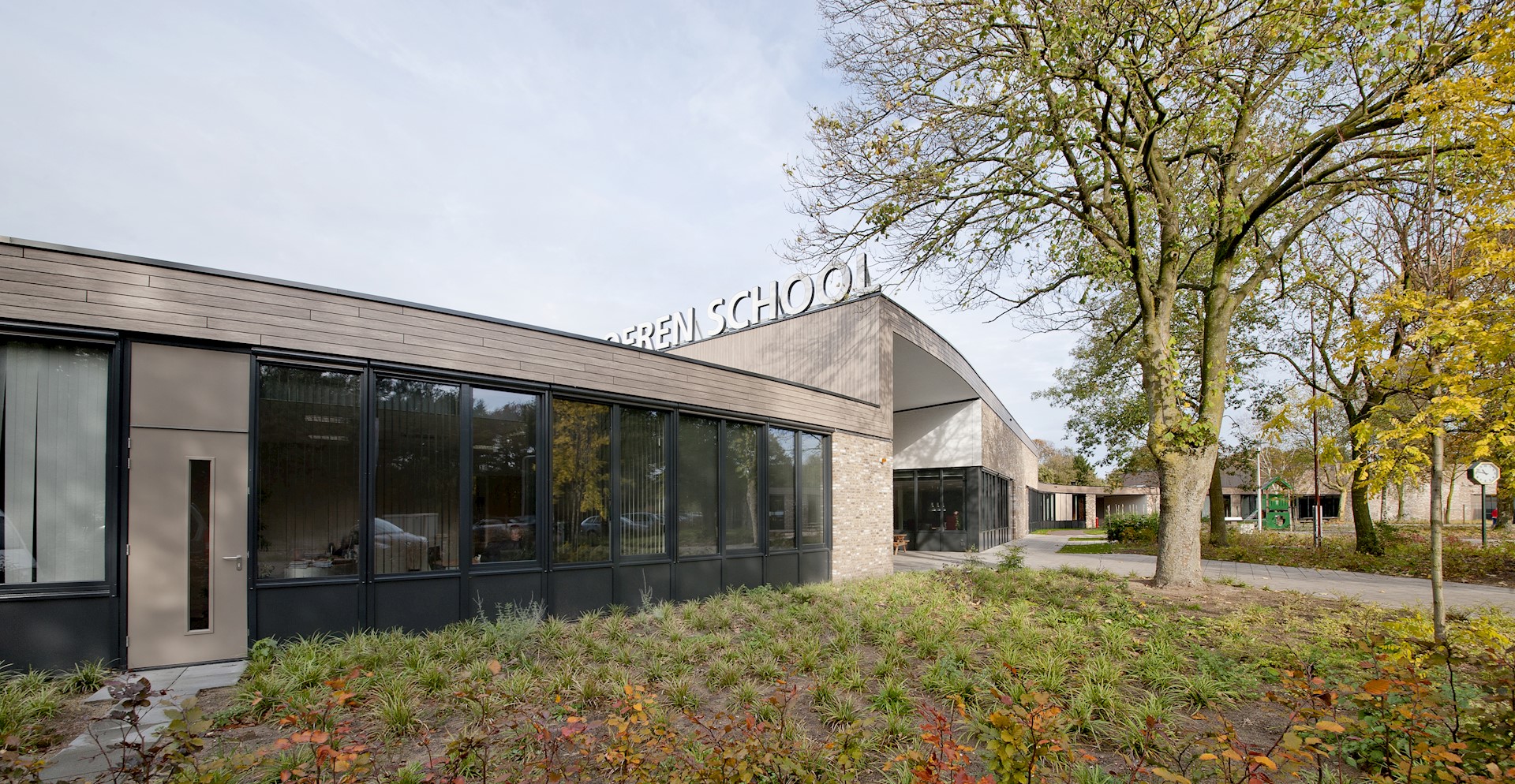 BewarenDe Herman Broerenschool bestaat uit verschillende paviljoens te midden van een bosachtige omgeving. Deze ‘campusopzet’ past niet alleen bij het landschap, maar ook bij het karakter van de brede school, die bestaat uit verschillende scholen voor speciaal onderwijs. De diverse, vrijstaande paviljoens hebben elk hun eigen voordeur. De ronde gevellijnen van de verschillende paviljoens zorgen voor een geborgen sfeer binnen én buiten, op de plekken tussen het hoofdvolume en de paviljoens. Hier liggen aan beide uiteinden van het hoofdgebouw besloten speelplaatsen, waar de kinderen ongestoord en veilig (onder toezicht) kunnen vertoeven