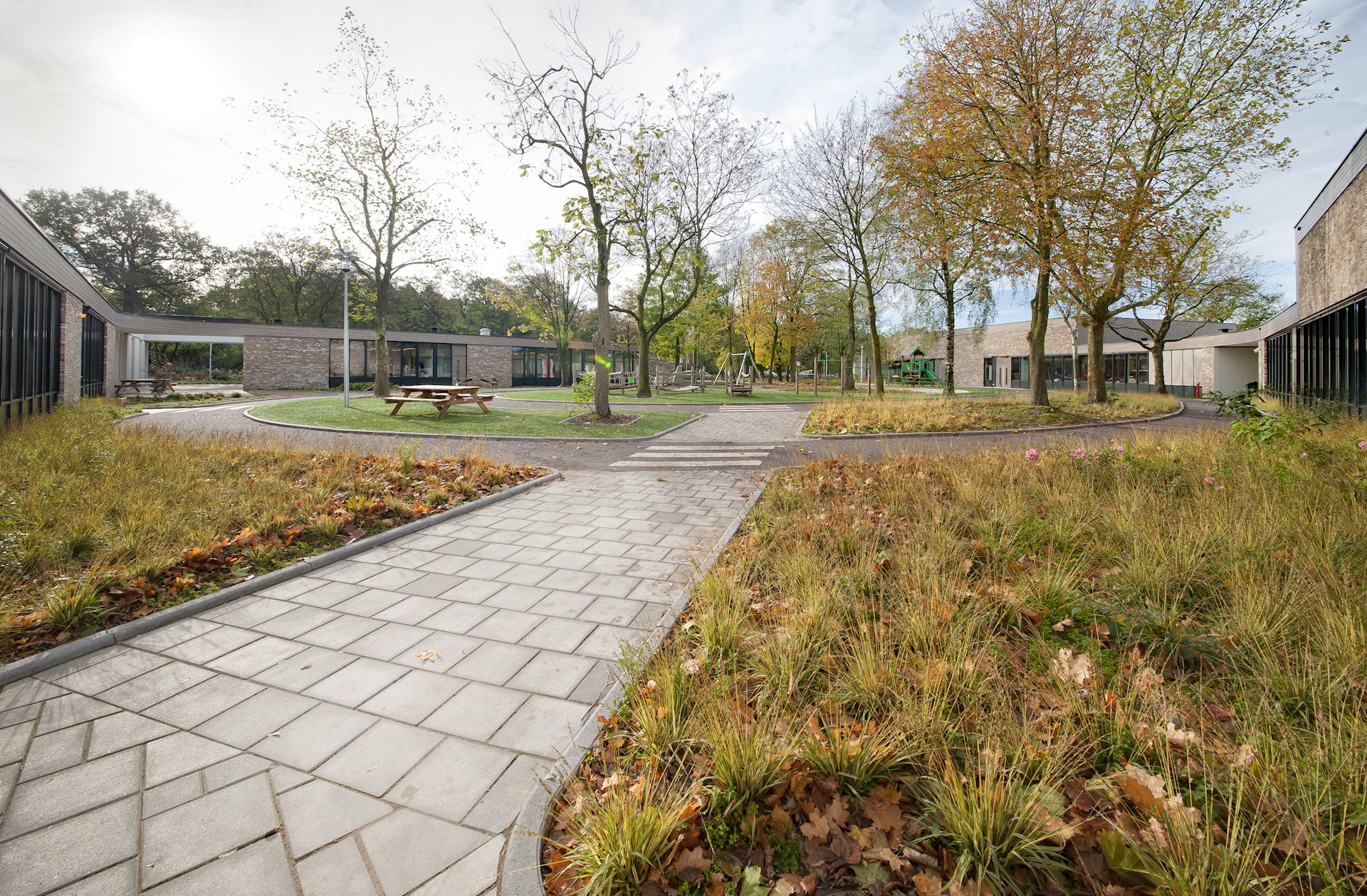 Bij deze twee onderwijsvormen spelen organisatie en orde een belangrijke rol. Een goede structuur is voor deze kinderen van essentieel belang. Die structuur is in de ordening van de gebouwen aangebracht. Dwars door het terrein loopt een slingerende hoofdmassa die het gebied in tweeën deelt. Er ontstaan daardoor twee duidelijke pleinen, waaraan de paviljoenachtige gebouwen zijn geplaatst. Zij zijn middels een slingerende daklijst aan elkaar gekoppeld. Door deze opzet ontstaan overwegend ronde vormen, die vriendelijk ogen, maar die de ruimten niettemin duidelijk inkaderen. De schoolpleinen kunnen hierdoor ook benut worden voor educatieve doeleinden. Zo zijn er fietspaden/‘autobanen’ op het speelterrein voor verkeerslessen en zijn praktijktuintjes aangelegd t.b.v. van lessen land- en tuinbouw.