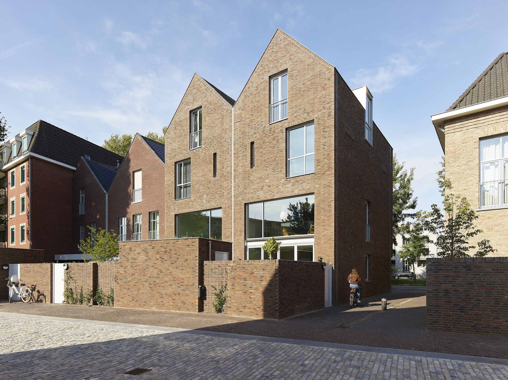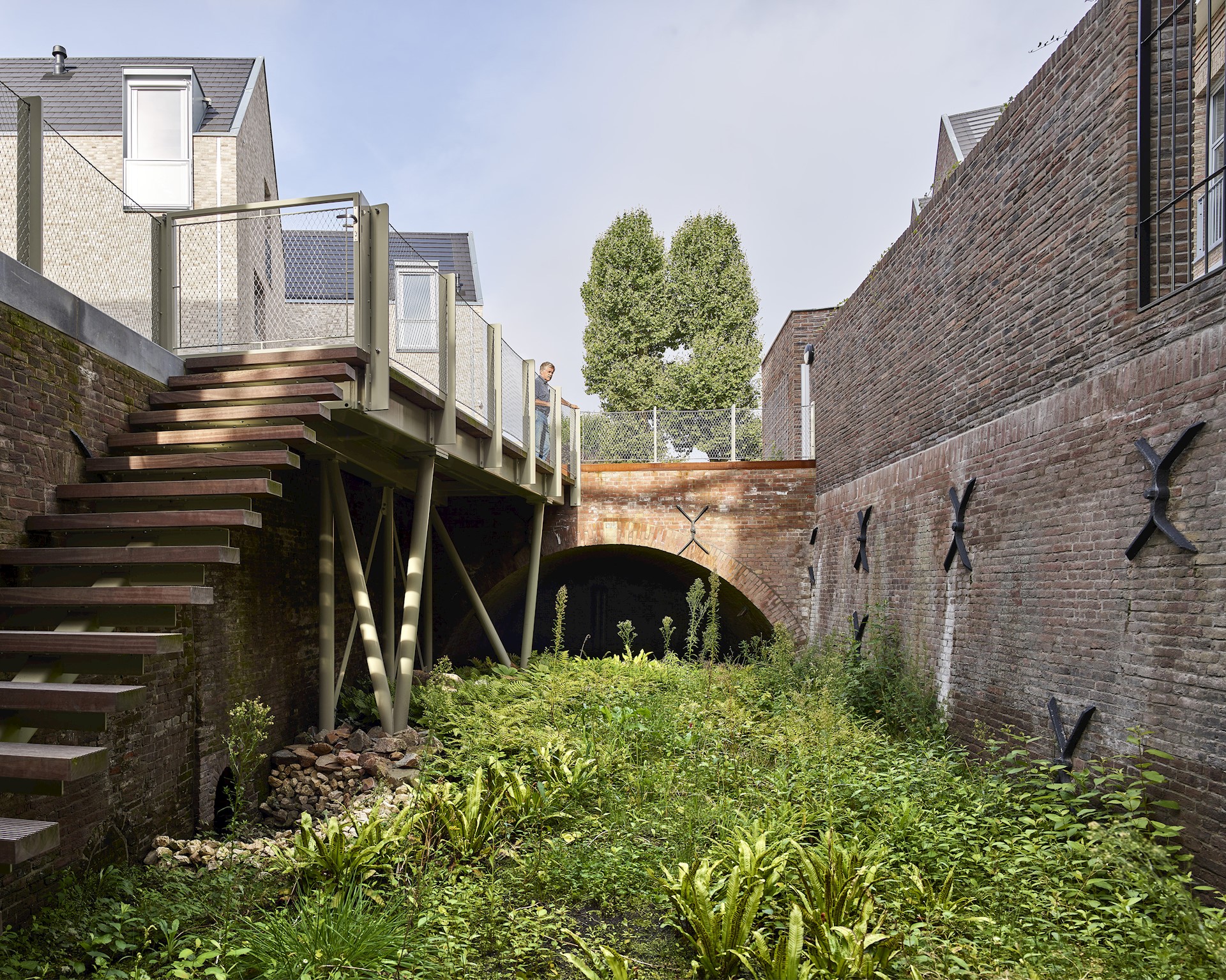 Dit project in deze historische omgeving is gevormd door hedendaagse uitdagingen als regenwaterafvoer, biodiversiteit en duurzame energie. Bij het ontwerpen van dit nieuwbouwplan hebben we in samenwerking met MTD Landschapsarchitecten de locatie benut bij het vinden van oplossingen. Zo hebben we om piekregen te kunnen afvangen een gedempt deel van de Dieze, dat verborgen lag onder het terrein, weer geopend. De woningen zijn hier zorgvuldig omheen geplaatst en het ‘nieuwe’ stukje Dieze zorgt ervoor dat het regenwater op de locatie wordt gehouden en niet in het riool wordt geloosd. Het zakt vanzelf de grond in! Ook biodiversiteit speelt een rol in het plan. Planten die in vochtige omgevingen groeien, zoals varens, zien we door het openbreken van de Dieze weer terug in de binnenstad. Daarnaast zijn er in de gevels nestkasten voor vogels gebouwd. Zo ontstaat er flora in de Dieze en fauna, zoals vleermuizen en gierzwaluwen, in de gevels.