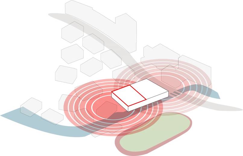 In het bestemmingsplan staan twee gescheiden functionerende gebouwen op een kavel: een sporthal en een school. Beide gebouwen zijn in ons plan georiënteerd op het water, op de atletiekbaan en de parkachtige Zuidbuurt. Het hoogste accent van de bouwmassa ligt bij de school (in lijn met de hoofdstructuur van het gebied), aflopend richting het park bij de sporthal. Het onderste deel van de gevel aan de kant van de woonwijk ligt een stuk terug ten opzichte van de verdieping. De karakteristieke overstekende bouwmassa boven het water, zorgt ervoor dat het gebouw al vanaf een afstand goed herkenbaar is. Ook vormt de overstek aan de zuidkant een natuurlijke zonwering: de basis voor een duurzaam gebouw.