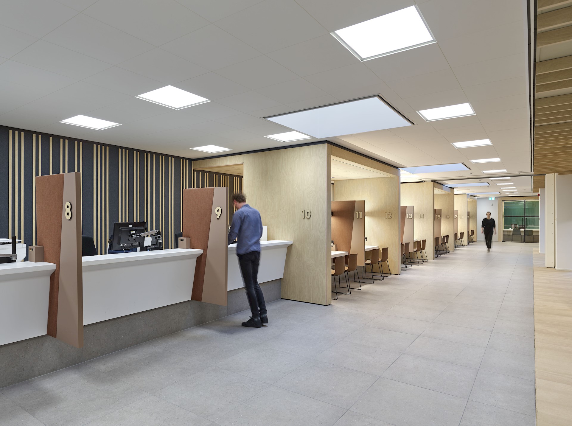 Er zijn vier verschillen soorten balies ontworpen. Deze zijn gepositioneerd van ‘reuring’ naar ‘rust’ en van een open naar gesloten karakter naarmate bezoekers zich verder van de entree bevinden. Afhankelijk van het type gesprek en de snelheid van afhandeling melden bezoekers zich bij een specifieke balie.