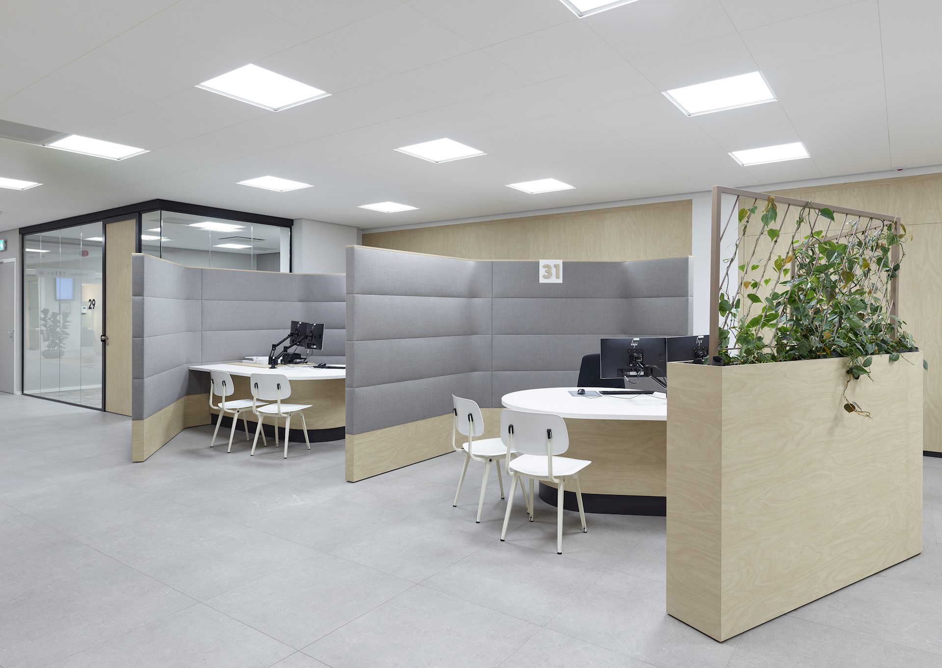 De halfomsloten balies met zitgelegenheid worden gebruikt door burgerzaken en de burgerlijke stand. Daar worden veel gegevens uitgewisseld, bijvoorbeeld bij het aanvragen van een paspoort. Akoestisch geactiveerde wanden met microperforatie zorgen voor een prettige akoestiek.