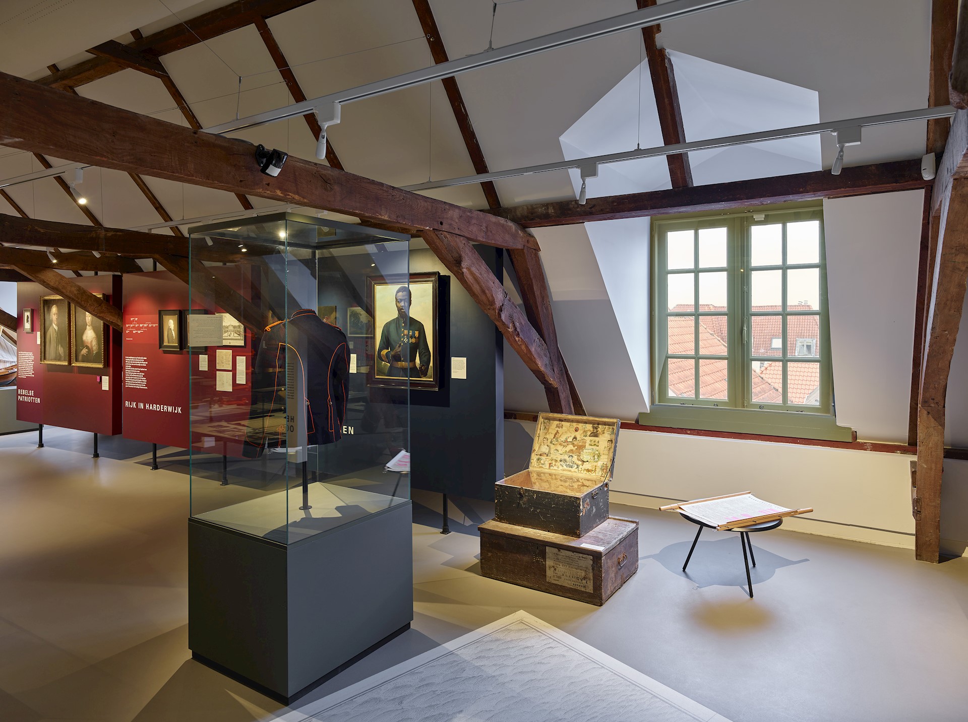 Bij het betreden van de zolder vallen de eeuwenoude spanten in de dakconstructie direct in het oog. Net als op de verdieping lag in deze ruimte een krakende houten vloer, die ook nog eens scheef lag. Deze vloer is daarom verwijderd, om plaats te maken voor een nieuwe zwevende dekvloer, afgewerkt met een naadloze gietmarmoleum. Op deze voorheen kromme en onpraktische ondergrond kunnen vitrines en losse objecten nu weer zonder problemen worden geplaatst. Wanneer we omhoog kijken zien we dat het zolderdak van het monumentale pand aan de binnenzijde is geïsoleerd en akoestisch is afgewerkt.