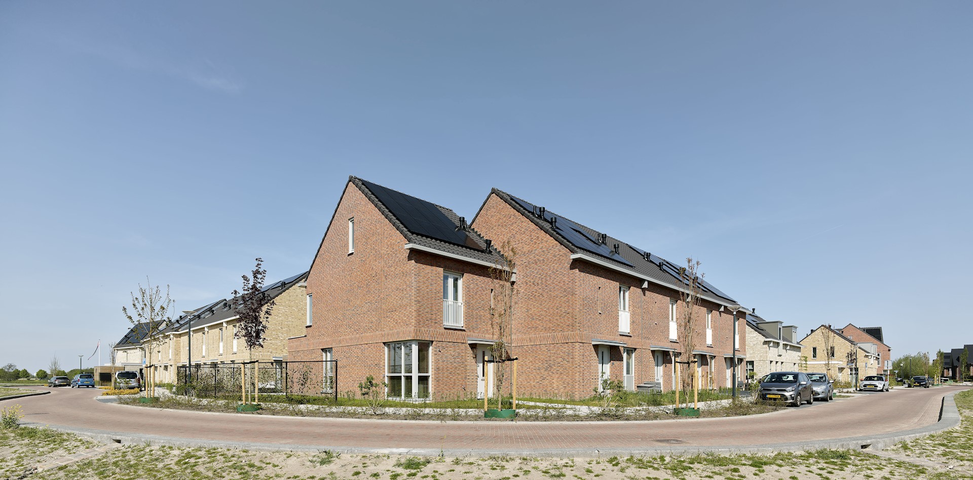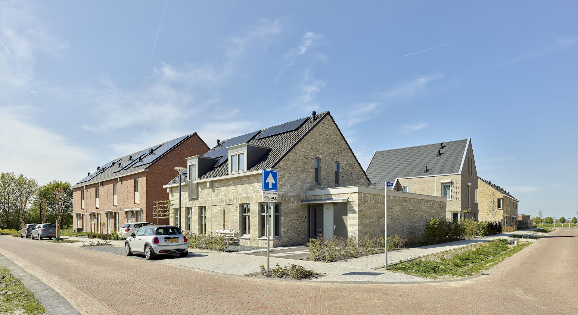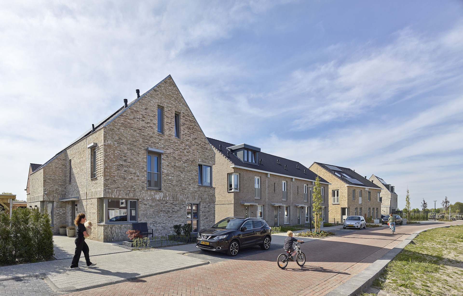 We hebben gekozen voor een architectuur die prikkelt en uitdaagt. Zo zijn de woonblokken bewust niet symmetrisch vormgegeven. Deze hebben een dynamische gevelcompositie met soms hoekramen op de begane grond en op andere plekken juist op de verdieping. In combinatie met bijzondere details, zoals hemelwaterafvoeren, ranke doorvalstangetjes en geornamenteerd metselwerk krijgt iedere woning een eigen uniek karakter. Met deze aandacht voor het dorpse, kleinschalige karakter kozen we wel voor uniformiteit in kleur en materialisatie. Alle woningen zijn dus verschillend, maar behoren tot dezelfde familie.