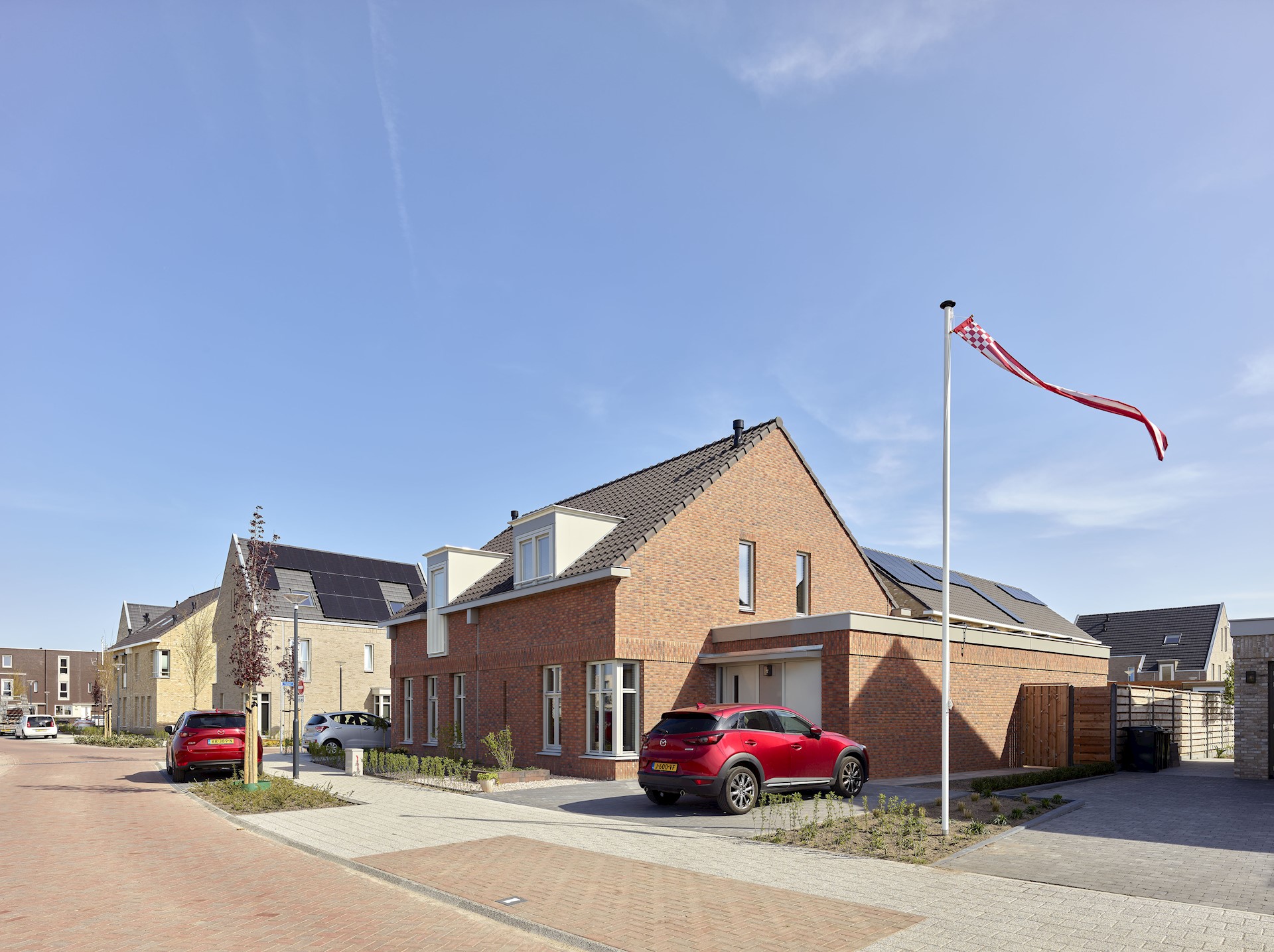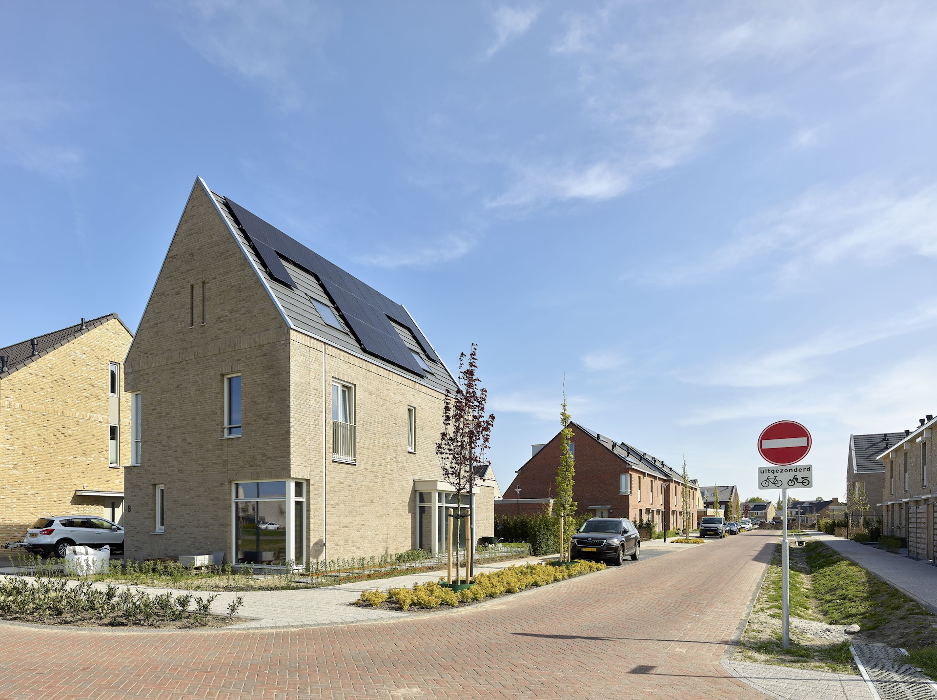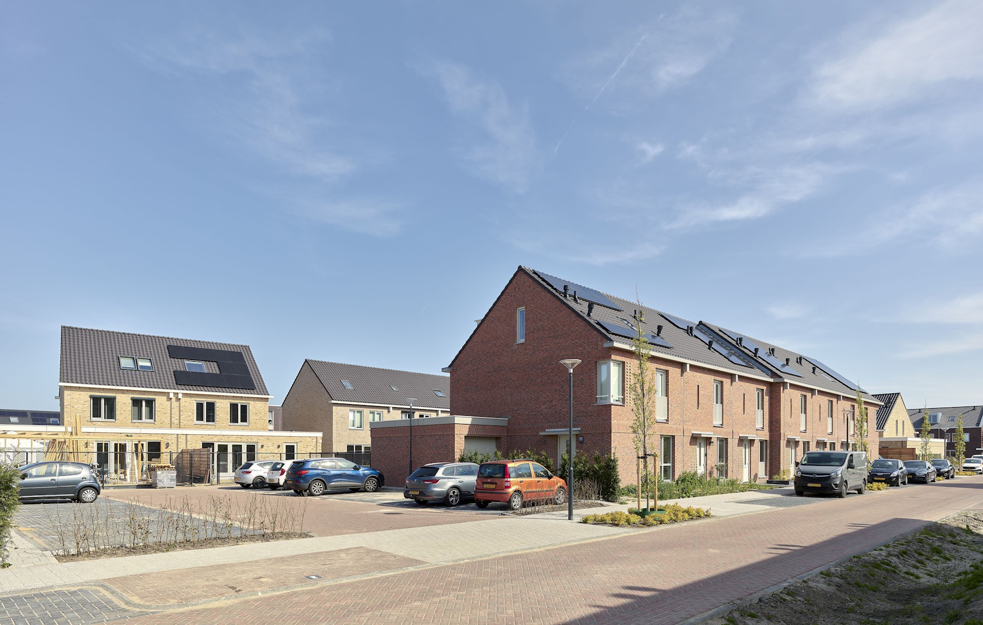 We hebben gekozen voor een architectuur die prikkelt en uitdaagt. Zo zijn de woonblokken bewust niet symmetrisch vormgegeven. Deze hebben een dynamische gevelcompositie met soms hoekramen op de begane grond en op andere plekken juist op de verdieping. In combinatie met bijzondere details, zoals hemelwaterafvoeren, ranke doorvalstangetjes en geornamenteerd metselwerk krijgt iedere woning een eigen uniek karakter. Met deze aandacht voor het dorpse, kleinschalige karakter kozen we wel voor uniformiteit in kleur en materialisatie. Alle woningen zijn dus verschillend, maar behoren tot dezelfde familie.