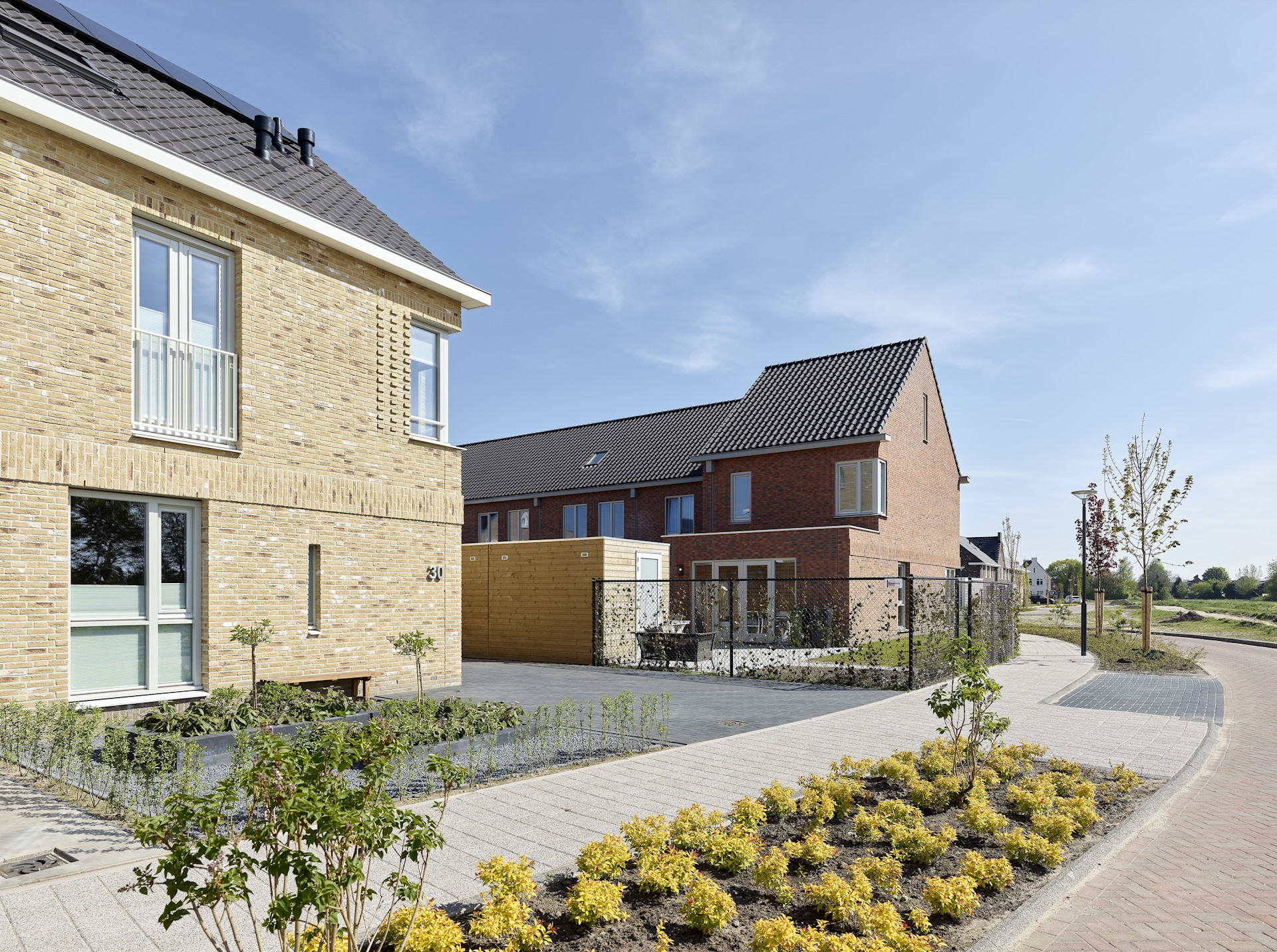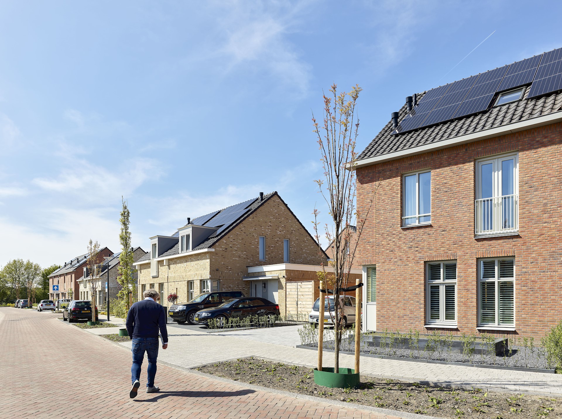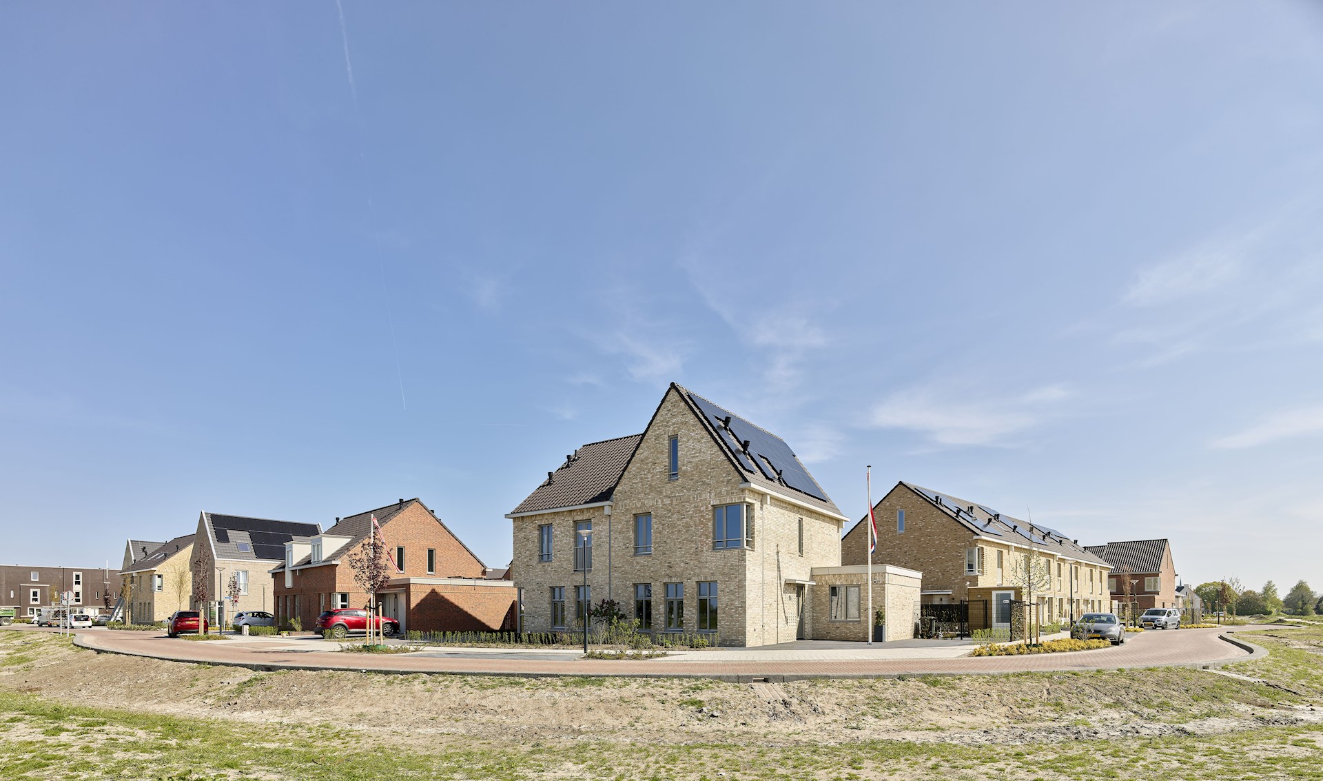 We zochten naar een uitstraling die past bij het dorpse en kleinschalige karakter van het landgoed. We kozen daarom voor het ontwerpen van vijf wooneilanden met een grote diversiteit aan woningen met een speelse verkavelingsstructuur en organische vormen. De woningen zijn dus niet recht naast elkaar geplaatst, maar sluiten met een kleine verdraaiing aan op de slingerende wegen, met groene hagen als erfafscheiding. Geen lange stedelijke bebouwingswanden, maar korte rijtjes, afgewisseld met twee-onder-een-kappers en vrijstaande woningen met een variatie aan daken en gevelindelingen. De schuine kappen en het metselwerk in warme pasteltinten zorgen voor vriendelijkheid en herkenbaarheid en een dorps en landelijk beeld. We hebben daarbij echter niet ingezet op een uitgesproken historiserende architectuur. Er is gezocht naar eigentijdse, maar tegelijkertijd traditioneel herkenbare woningen waarin men zich direct thuis voelt.