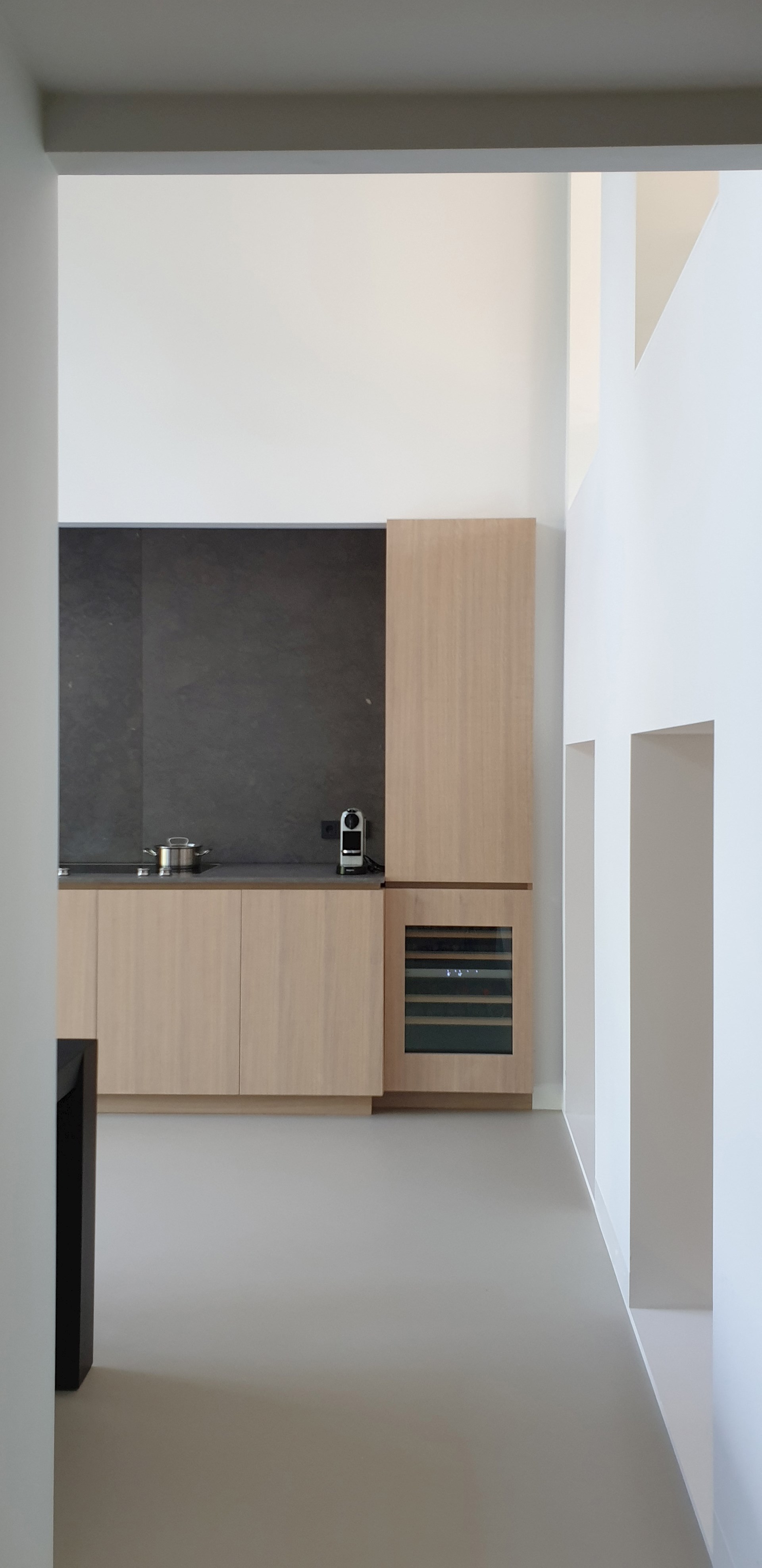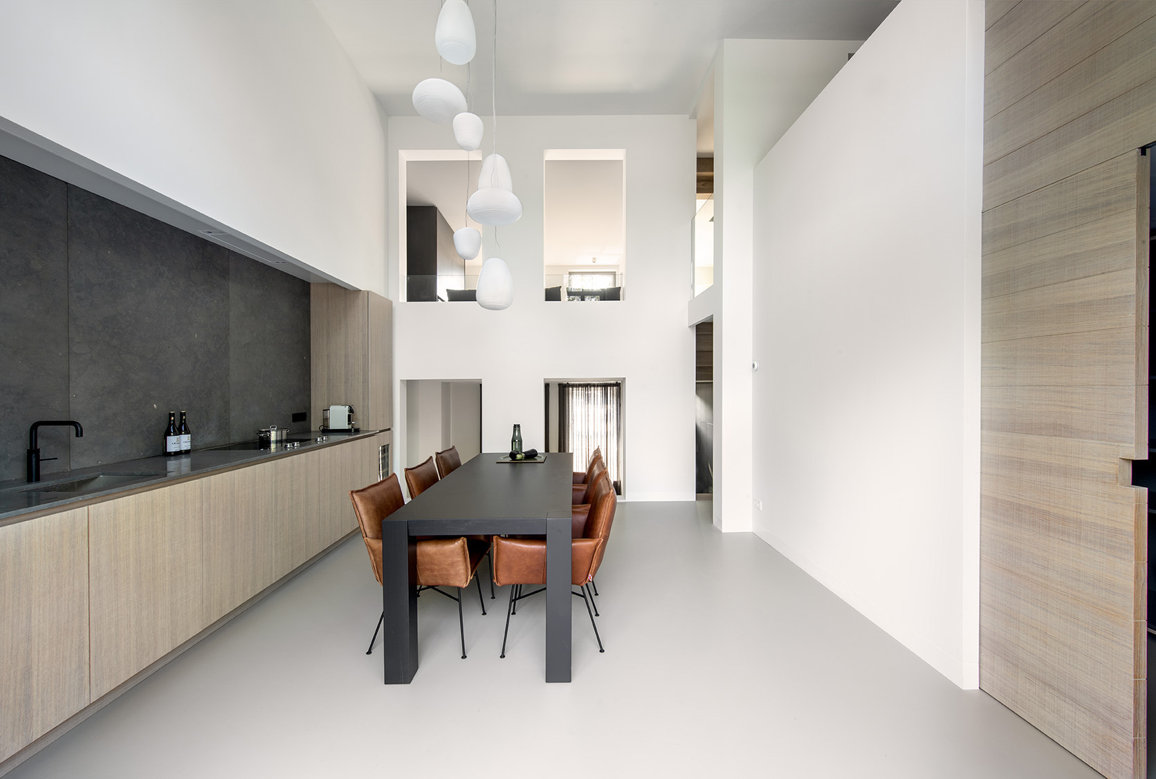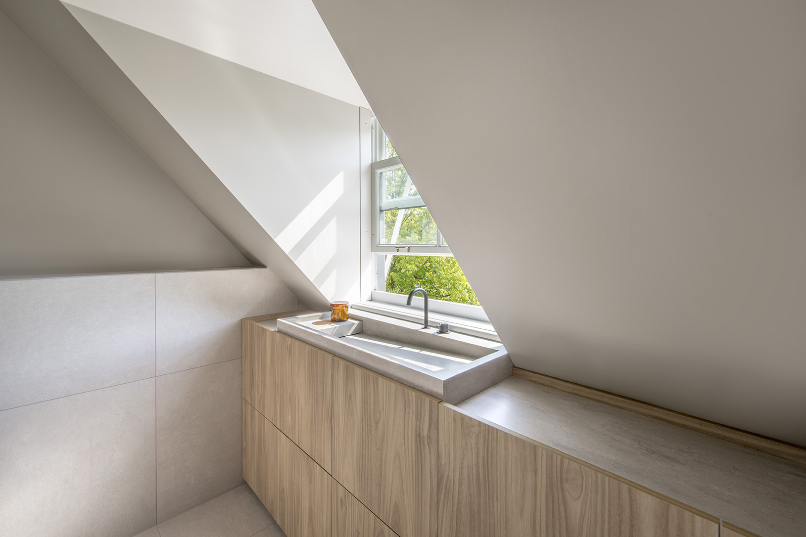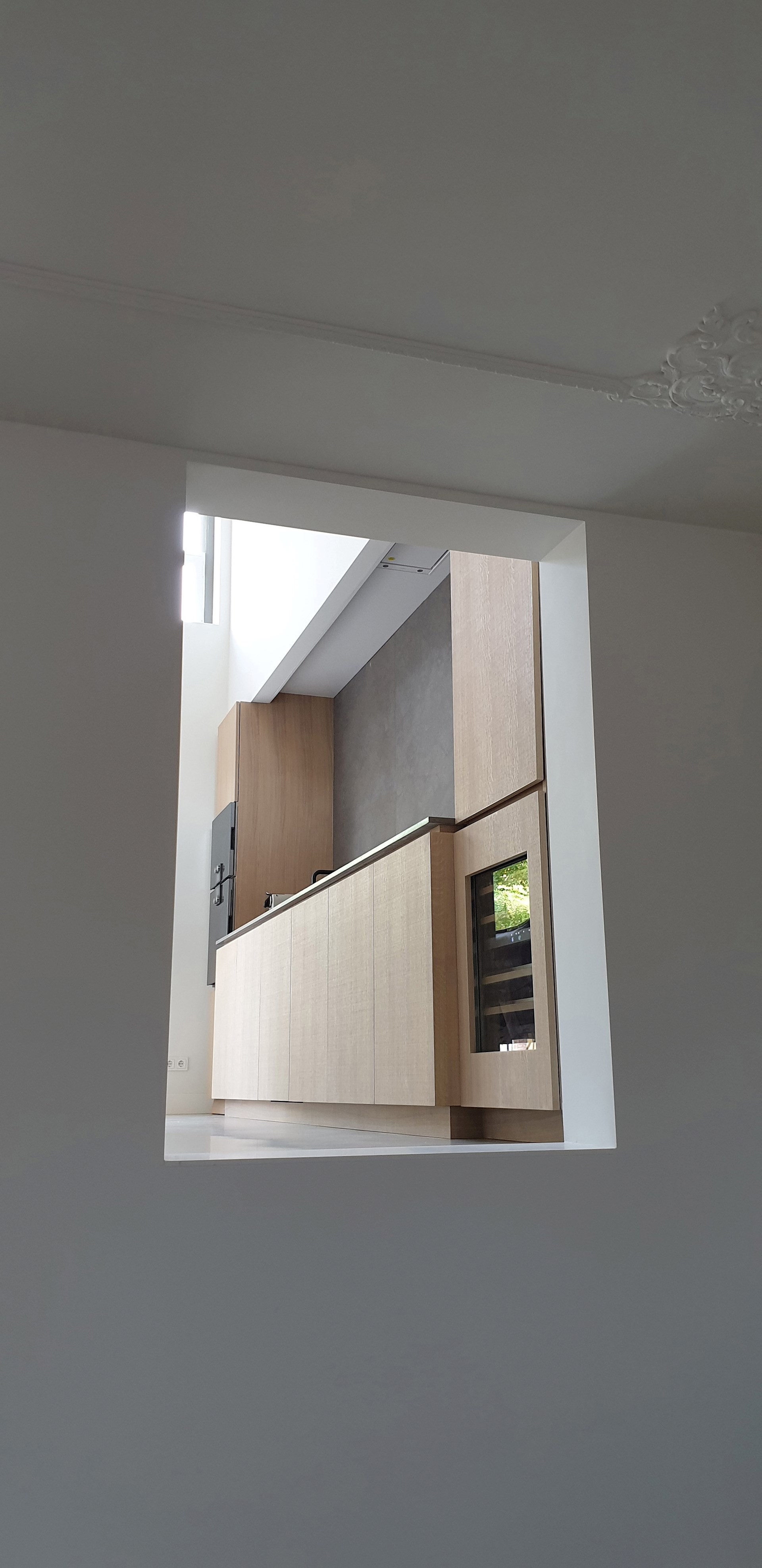 De keuken ligt nu direct aan de tuin en heeft extra hoogte gekregen doordat we de verdiepingsvloer hier weggehaald hebben. De vide die hierdoor is ontstaan, verbindt de verschillende vertrekken met de keuken. Zo kijk je nu vanaf de balustrade van de studieruimte de keuken in en vanuit de keuken kun je de muziekkamer bij de voorgevel zien. Er ontstaan op deze manier prachtige doorkijkjes door het hele huis.