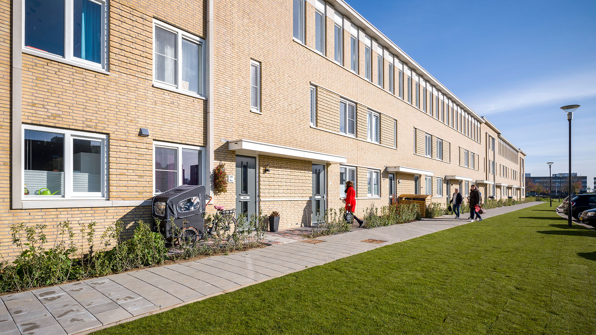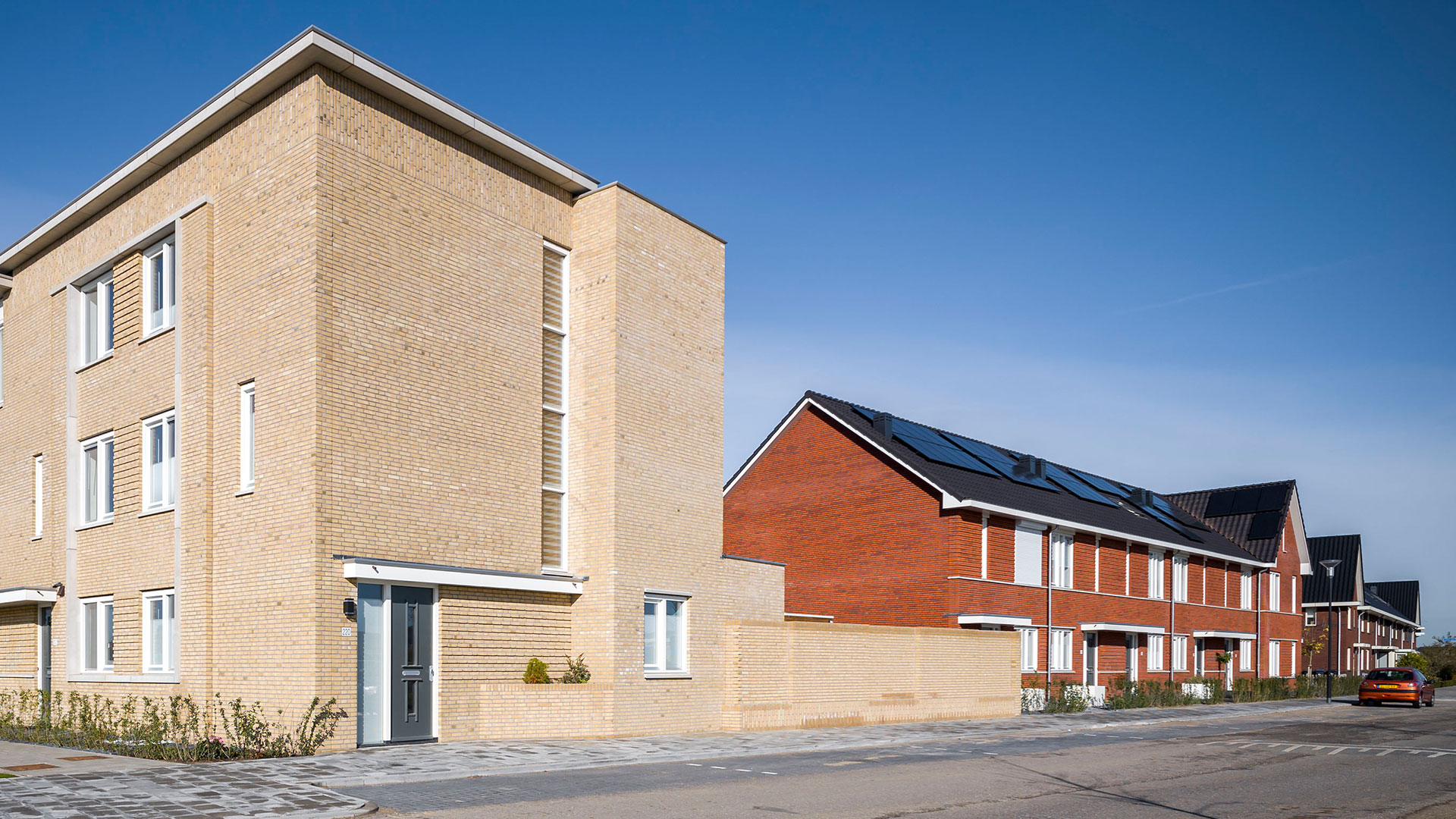 Dat het ook anders kan, is te zien in het ontwerp voor de rij woningen die het zuidelijkst liggen. In de vormgeving is hier gekozen voor een stijl die refereert aan de Amsterdamse School. De robuuste, expressieve baksteenarchitectuur met een duidelijk woningoverstijgende compositie van het totale volume kenmerkt het ontwerp. Met twee hoekaccenten en een accent in het middendeel wordt de rij opgedeeld in meerdere volumes. In de gevels zijn plastische baksteenaccenten toegepast en een duidelijke beëindiging van het volume met rollagen en een doorgaande betonnen dakrand.
